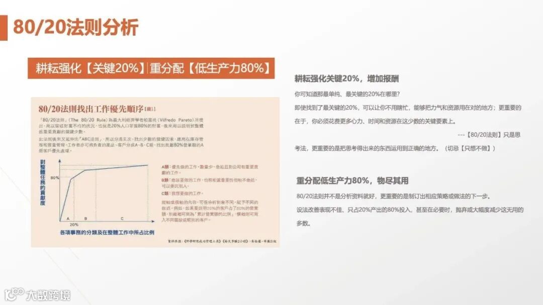 1. 识别关键要素:如20%的产品贡献80%利润,20%的客户带来80%营收。