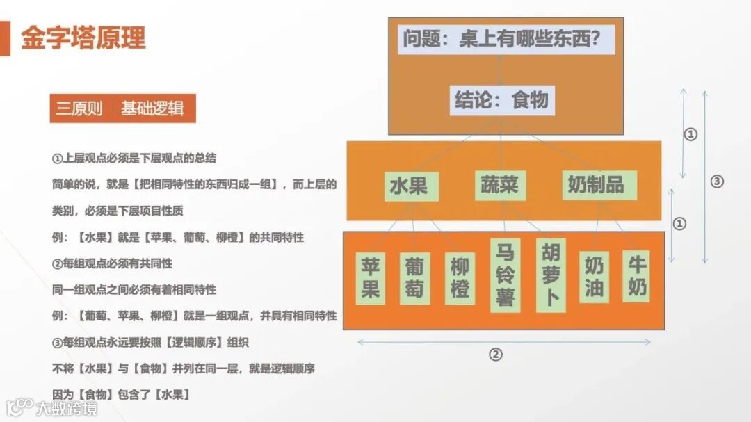 金字塔原理遵循三大原则:上层观点是下层的总结(如“水果”统摄“苹果、葡萄、柳橙”)、同组观点具共同特性、按逻辑顺序组织(避免“水果”与“食物”并列)。