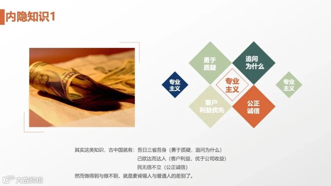 正如麦肯锡内隐知识所强调的:“吾日三省吾身”(质疑本质)、“己欲达而达人”(客户利益优先)、“民无信不立”(公正诚信),这些准则构成了顾问工作的底层价值观。