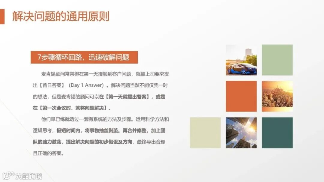 这种方法避免了“处理所有资料再解答”的低效,例如顾问在第一天接触客户时,就会提出“首日答案”(Day 1 Answer),通过后续分析不断修正。