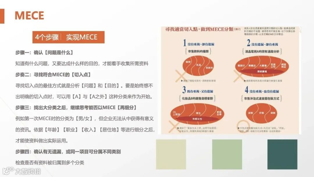 MECE(Mutually Exclusive, Collectively Exhaustive)要求分类既不重叠也不遗漏。操作步骤如下: