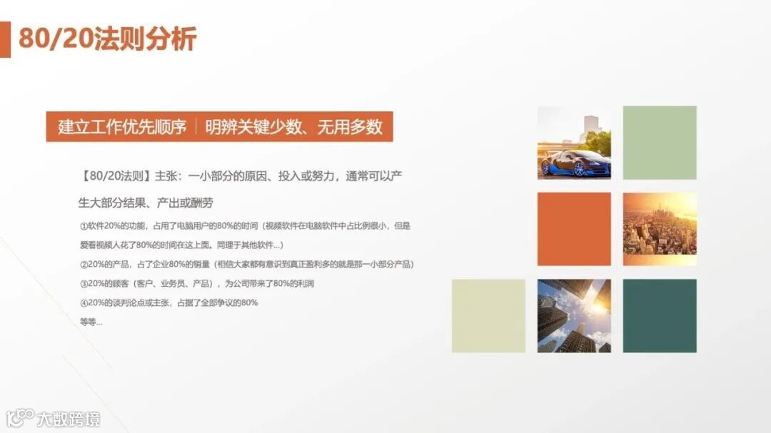 该法则主张“20%的因素决定80%的结果”,应用步骤为: