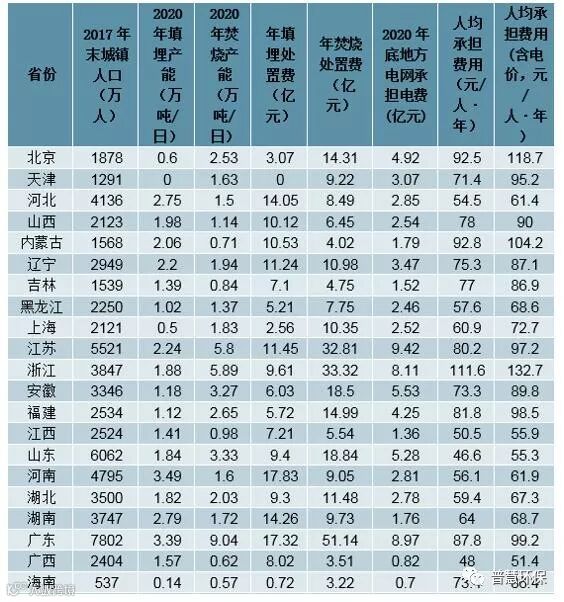 根据《“十三五”全国城镇生活垃圾无害化处理设施建设规划》,2015年底全国垃圾填埋和焚烧产能分别为50.15万吨/日、23.52万吨/日;目标到2020年填埋和焚烧产能分别达到47.71万吨/日、59.14万吨/日,其中由于部分填埋项目封场,且在国家重点鼓励发展焚烧处置方式的背景下,新增填埋产能较难,导致2020年填埋产能较2015年略有下滑。我们以各省份的垃圾处置产能和垃圾收运及处置费来对各省居民的理论应承担垃圾处置费进行测算。
