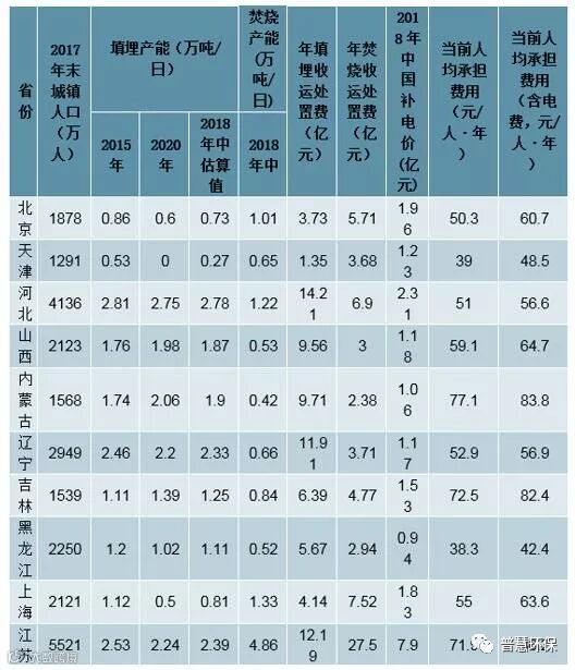 处置产能:截至2018年中我国已投运垃圾焚烧产能约38.6万吨/日,同期填埋产能取2015年和2020年产能平均值即48.9万吨/日;收运及处置费:假设吨垃圾收转费为80元,填埋和焚烧处置费均价分别为60元/吨和75元/吨,即吨垃圾填埋和焚烧的收运和处置费合计分别为140元、155元;人口数量:考虑各省份的城镇人口,2017年底全国城镇人口总计约8.2亿人;经测算,以2018年中的垃圾处置产能来看,全国理论城镇年人均承担吨垃圾收运处置费为57.2元;垃圾焚烧发电吨垃圾上网电量280kwh以内实行0.65元/kwh的标杆电价,其中地方电网承担电价为当地燃煤标杆电价和两级分摊中的0.1元/kwh,其余部分为国家可再生能源基金进行补贴,我们将国补电价部分同样纳入居民承担部分进行考虑,全国平均约为64.5元/人·年。