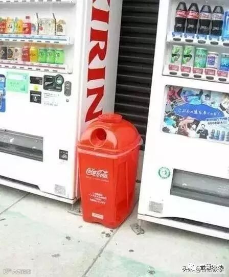 在日本生活中有很多环保的习惯,人们不会拿着瓶子满街丢弃,他们会在自动售货机旁边喝完,把瓶子留在旁边的垃圾桶里再离开。