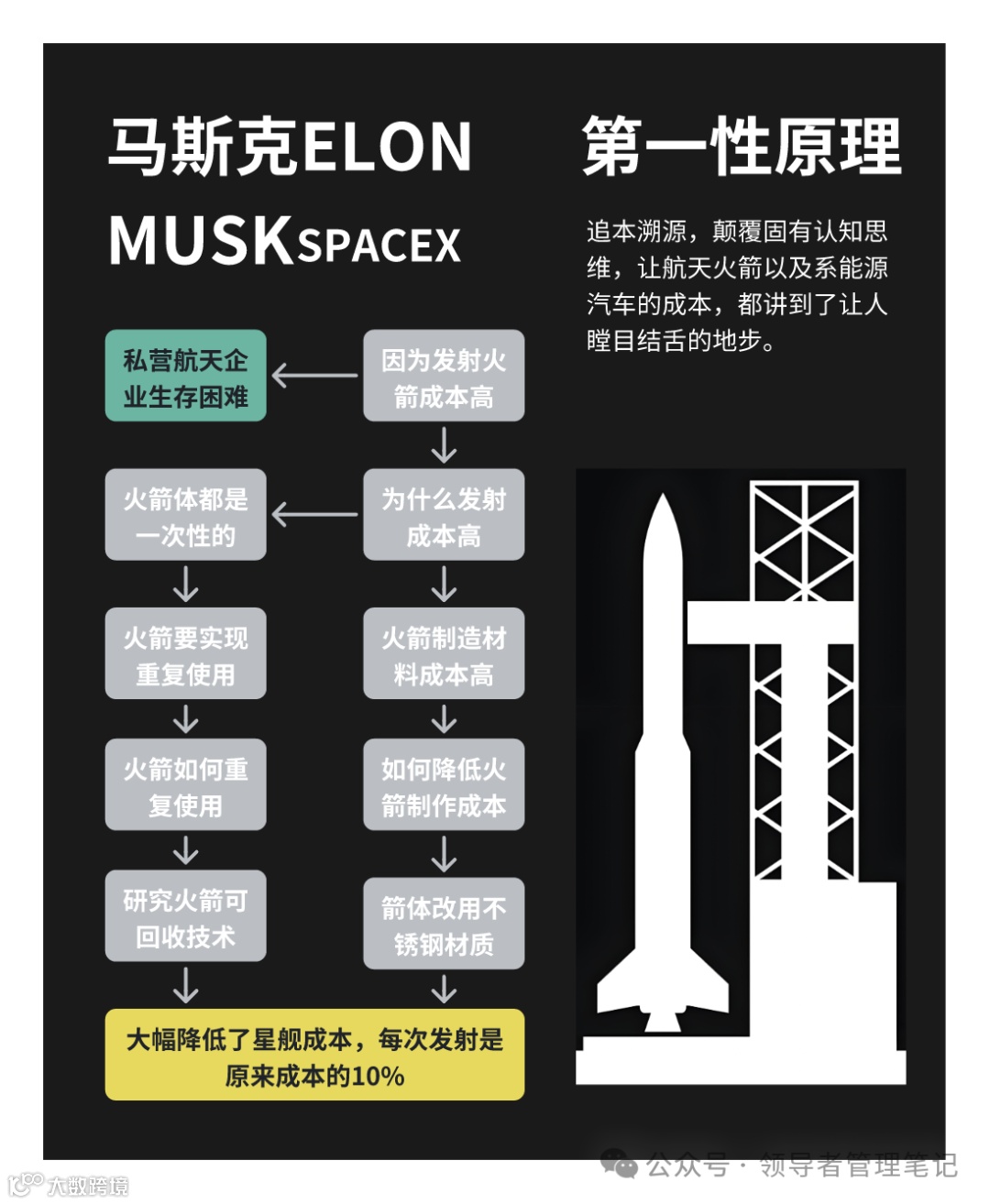 • 逆向工程:基于基本定律进行组合创新(如SpaceX火箭成本从2%市场价倒推材料重构)
