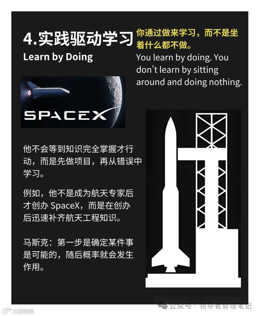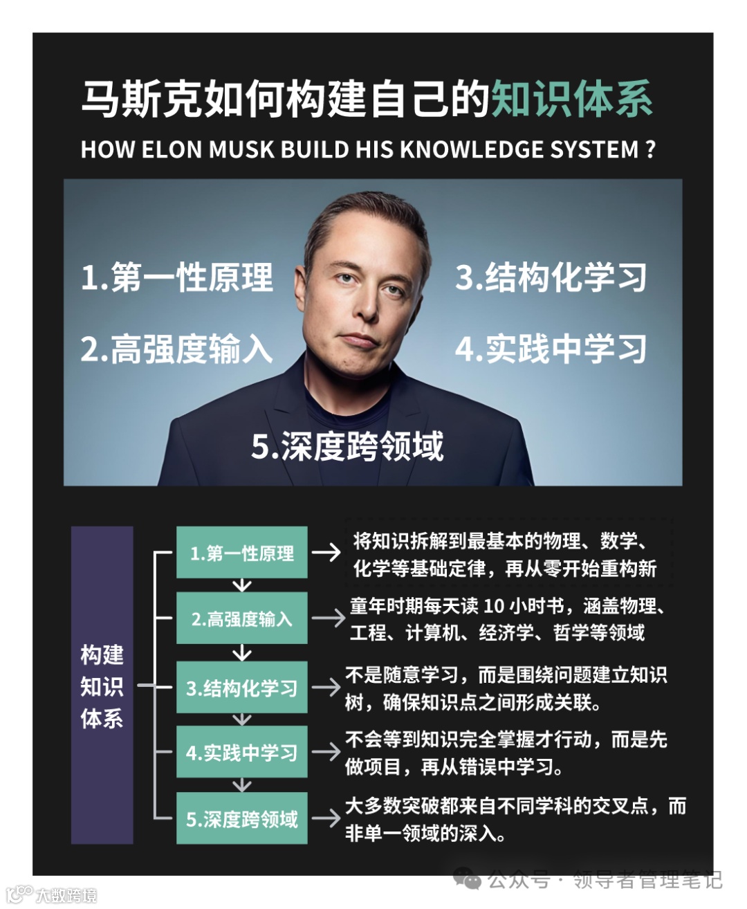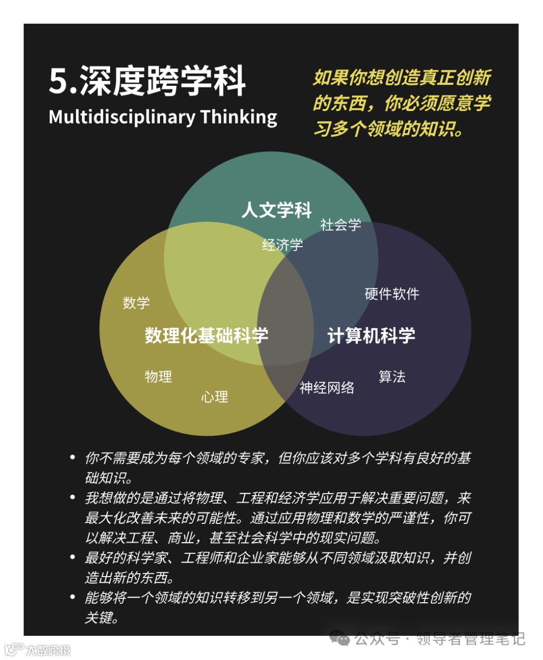 • T型知识架构:垂直深度(火箭推进技术)✖️横向广度(经济学、戏剧学跨界融合)