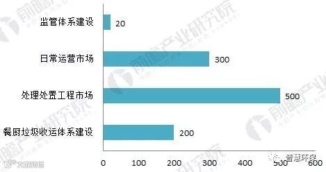 根据前瞻产业研究院发布的《2018-2023年中国餐厨垃圾处理行业发展前景预测与投资战略规划分析报告》预计,“十三五”期间整个餐厨垃圾总体市场空间可达1000-1500亿元。其中餐厨垃圾收运体系建设约需200亿(收运体系其中包括垃圾容器、车辆,包括车辆和垃圾容器之间的衔接)、处理处置工程市场约需500-1000亿、日常运营市场大约是300亿、监管体系建设大约能形成20亿左右的市场规模。