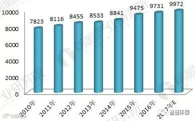 图表2:2010-2017年中国餐厨垃圾产生量规模趋势图(单位:万吨,%)