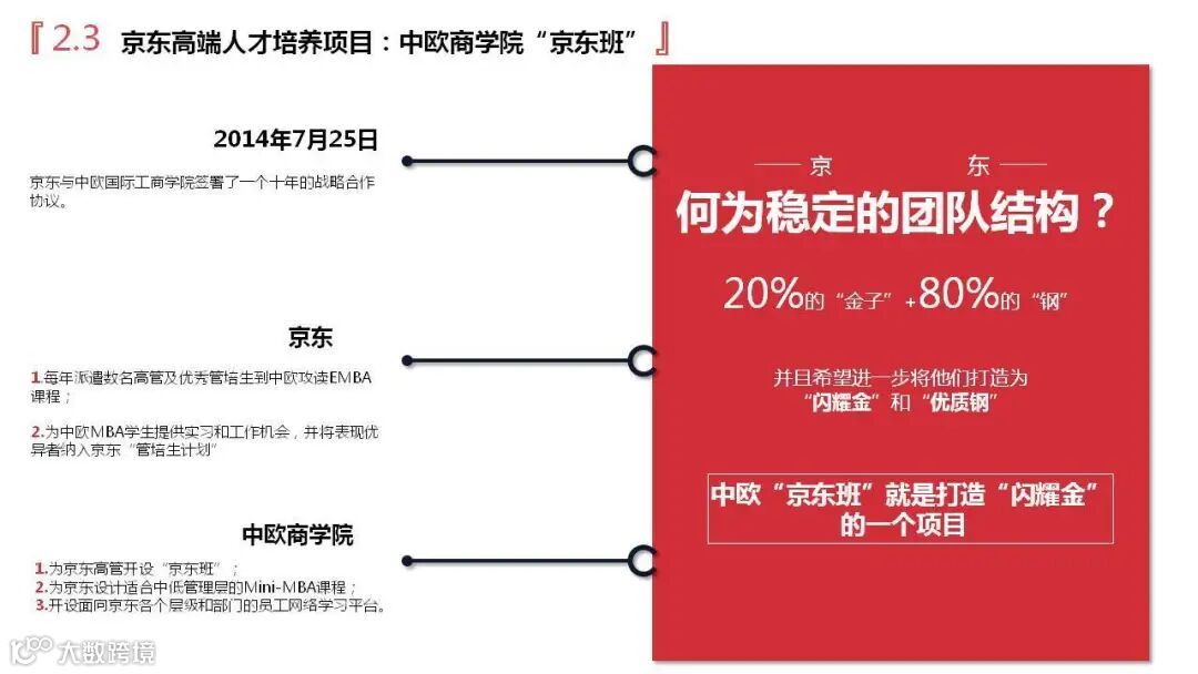 金子,指那些价值观和符合,业绩能力也很好的人;钢,指那些能力、业绩、价值观都不错的人,这两类人是京东的中流砥柱。