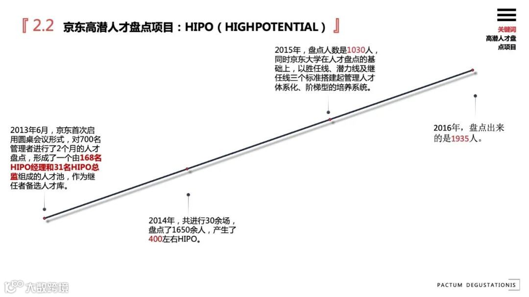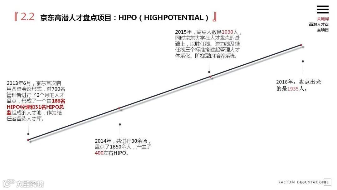 基于此,京东自2013年开始启动了京东高潜人才盘点项目:HIPO(HIGH POTENTIAL),每年对管理层进行至少2个月的人才盘点,挑选高潜人才进入管理者继任库。2013年产生了168名HIPO经理和31名HIPO总监,此后这个数字逐年增加,2014年为400名,2015年1030人,2016年1935人。