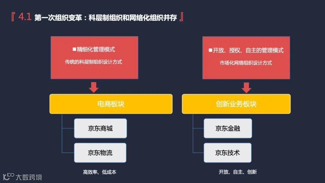 “8150”原则的核心是保证组织的扁平化,只有坚持该原则,才能保证企业CEO和员工之间只隔了5层管理者。从理论上来看,只要一个公司的员工不超过300万名员工,就可以只有6层管理者。同时,京东先后两次进行大的组织改革,逐渐转变为灵活多变的积木化组织结构。