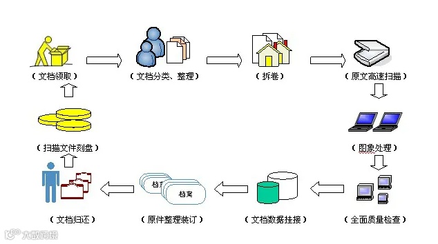 档案数字化加工业务总体流程包括:档案调卷、整理及著录、档案扫描、影像处理、数据质检、数据挂接、文档归还、数据备份。先后顺序为:调卷 > 著录 > 扫描 > 处理 > 质检 > 挂接 > 归还 > 备份。