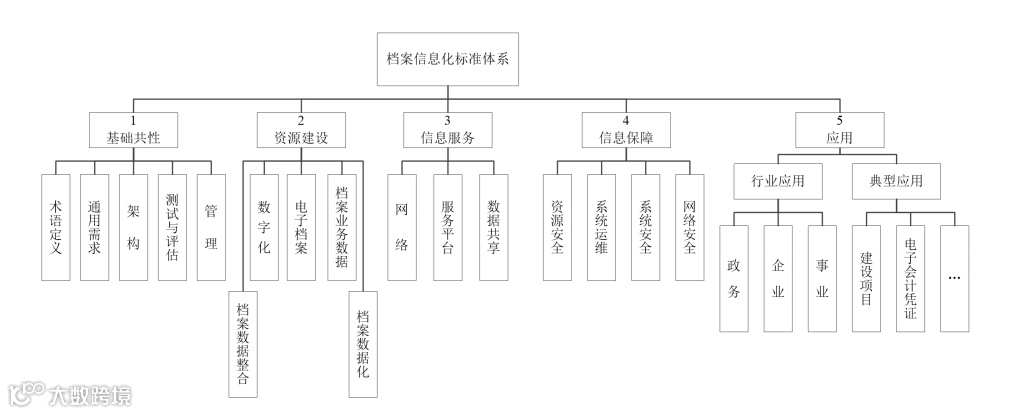 档案信息化标准体系框架包括基础共性、资源建设、信息服务、 信息保障、应用五大类标准。