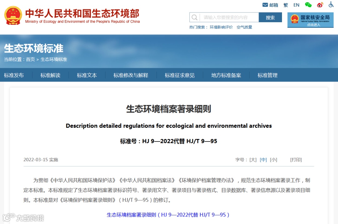 为贯彻《中华人民共和国环境保护法》《中华人民共和国档案法》《环境保护档案管理办法》,规范生态环境档案著录工作,制定本标准。本标准规定了生态环境档案著录标识符号、著录用文字、著录项目与著录格式、目录数据库、著录信息源以及著录项目细则。