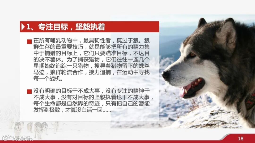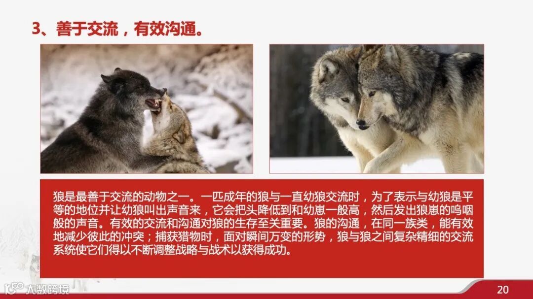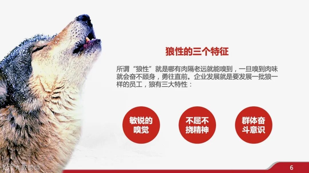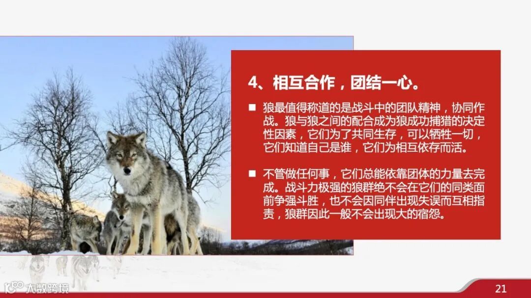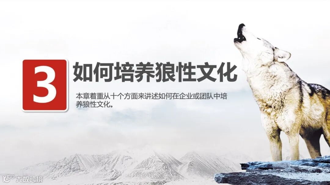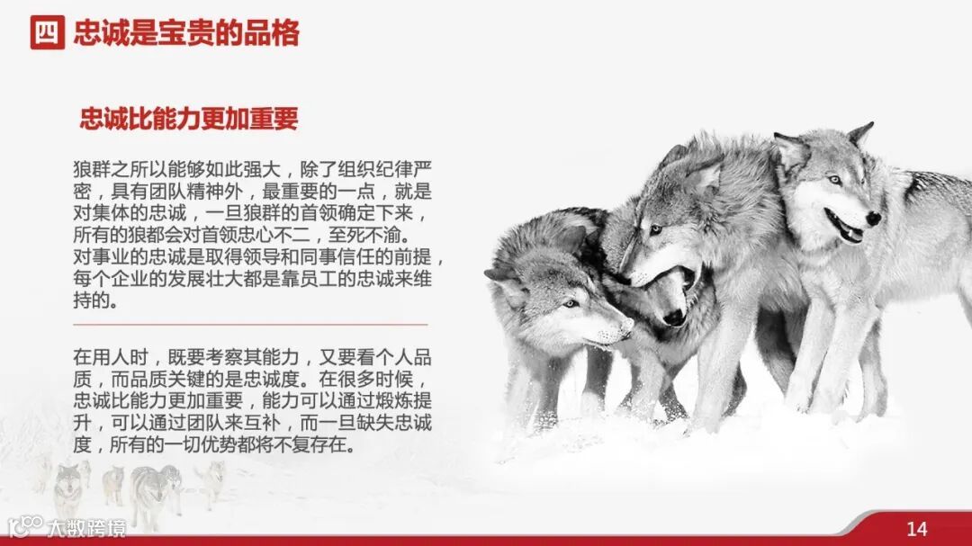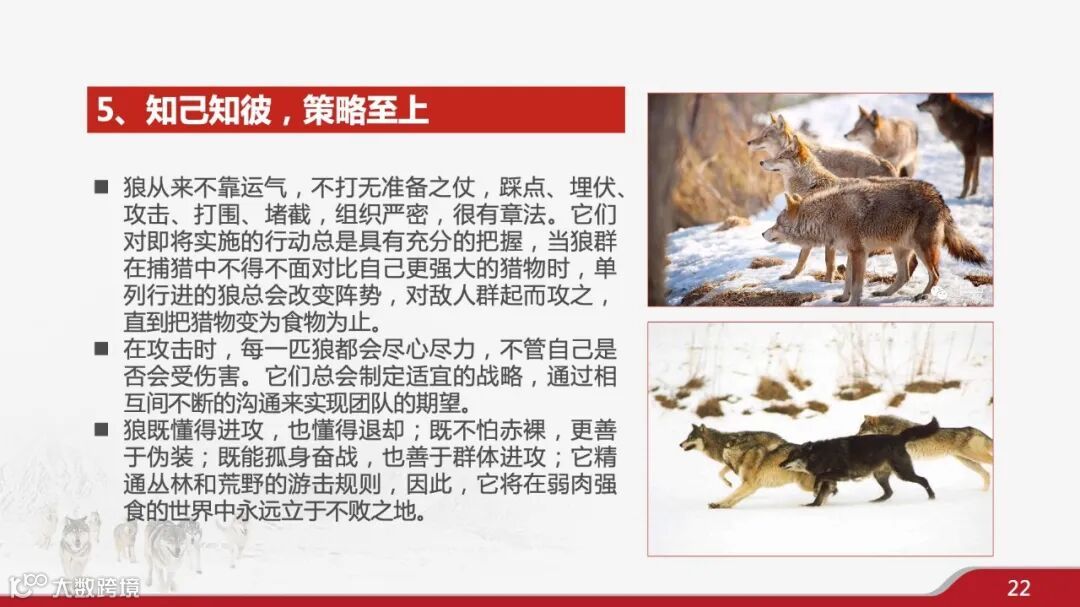 ►领导者说:狼者,猛兽也,群动之族。陆地上生物最高的食物链终结者之一,是群居动物中最有秩序、纪律的族群。狼性文化,一种先进的企业文化,狼性文化中最重要的是对团队的协作的重视,以及不抛弃、不放弃的执着精神,还有克服困难的勇气等方面。在这个竞争日趋激烈的社会,学习狼的精神,打造狼性文化,无论对于个人还是团队都有着极其重要的现实意义。获取PPT请见文末