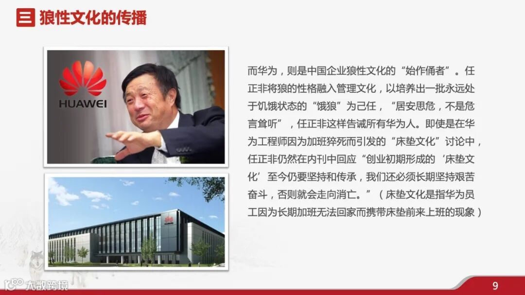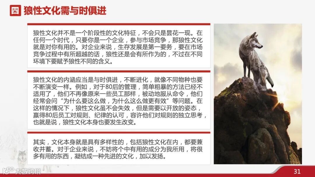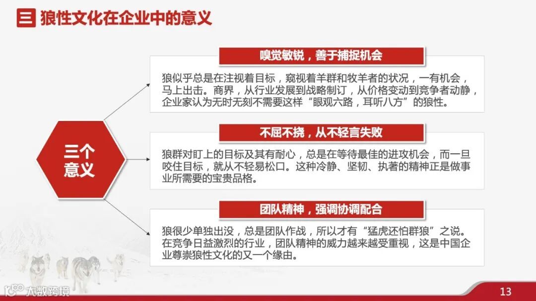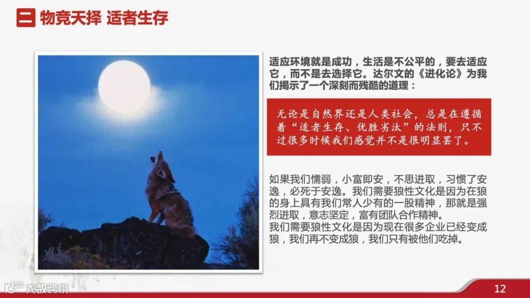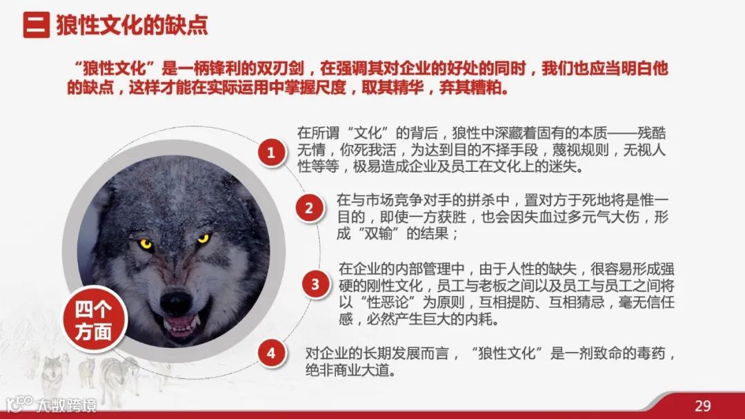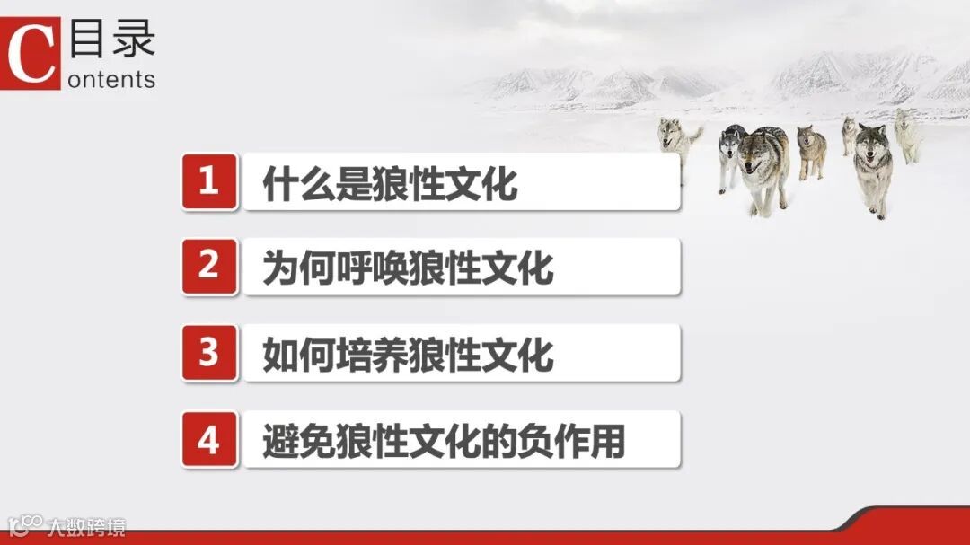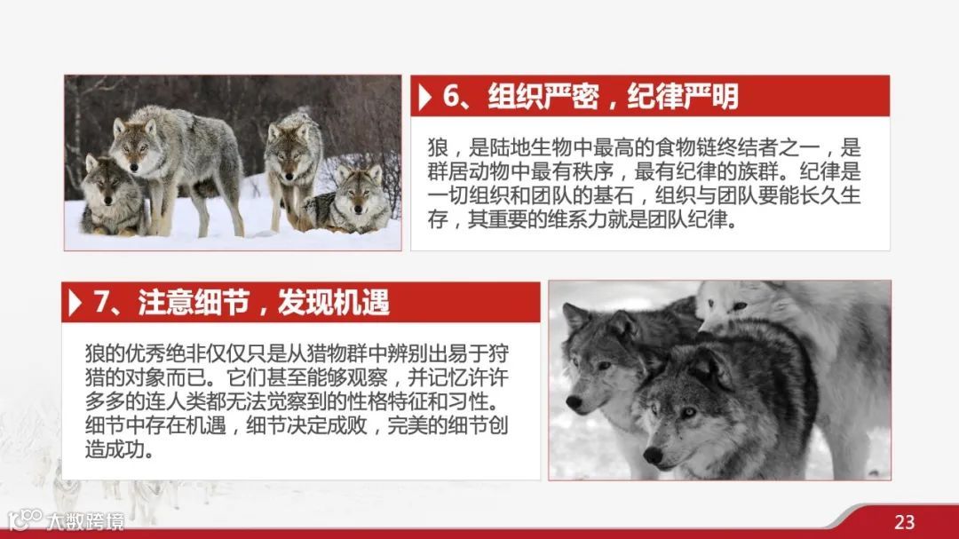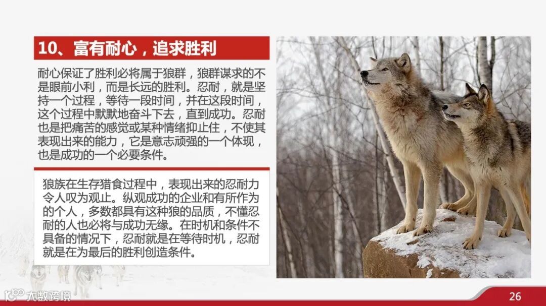 ►领导者说:狼者,猛兽也,群动之族。陆地上生物最高的食物链终结者之一,是群居动物中最有秩序、纪律的族群。狼性文化,一种先进的企业文化,狼性文化中最重要的是对团队的协作的重视,以及不抛弃、不放弃的执着精神,还有克服困难的勇气等方面。在这个竞争日趋激烈的社会,学习狼的精神,打造狼性文化,无论对于个人还是团队都有着极其重要的现实意义。获取PPT请见文末