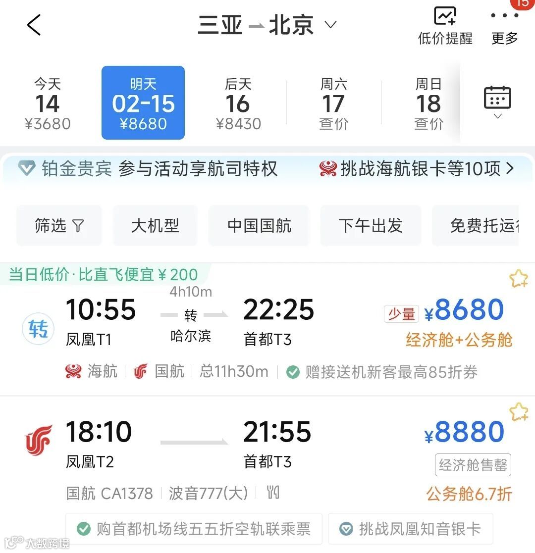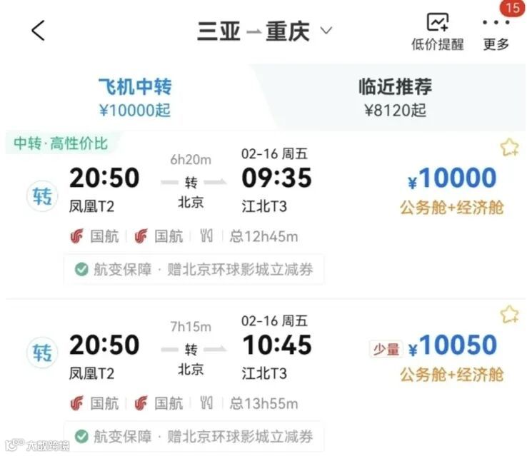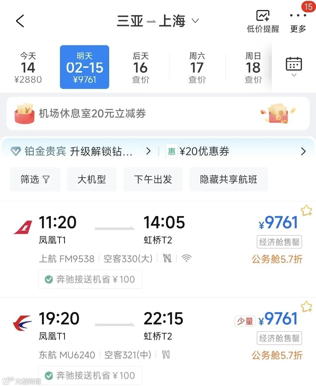 2月12日-17日,三亚出发的机票被卖出万元天价。吓退大多数旅游返程者。以15日回上海为例,票价高达9700余。