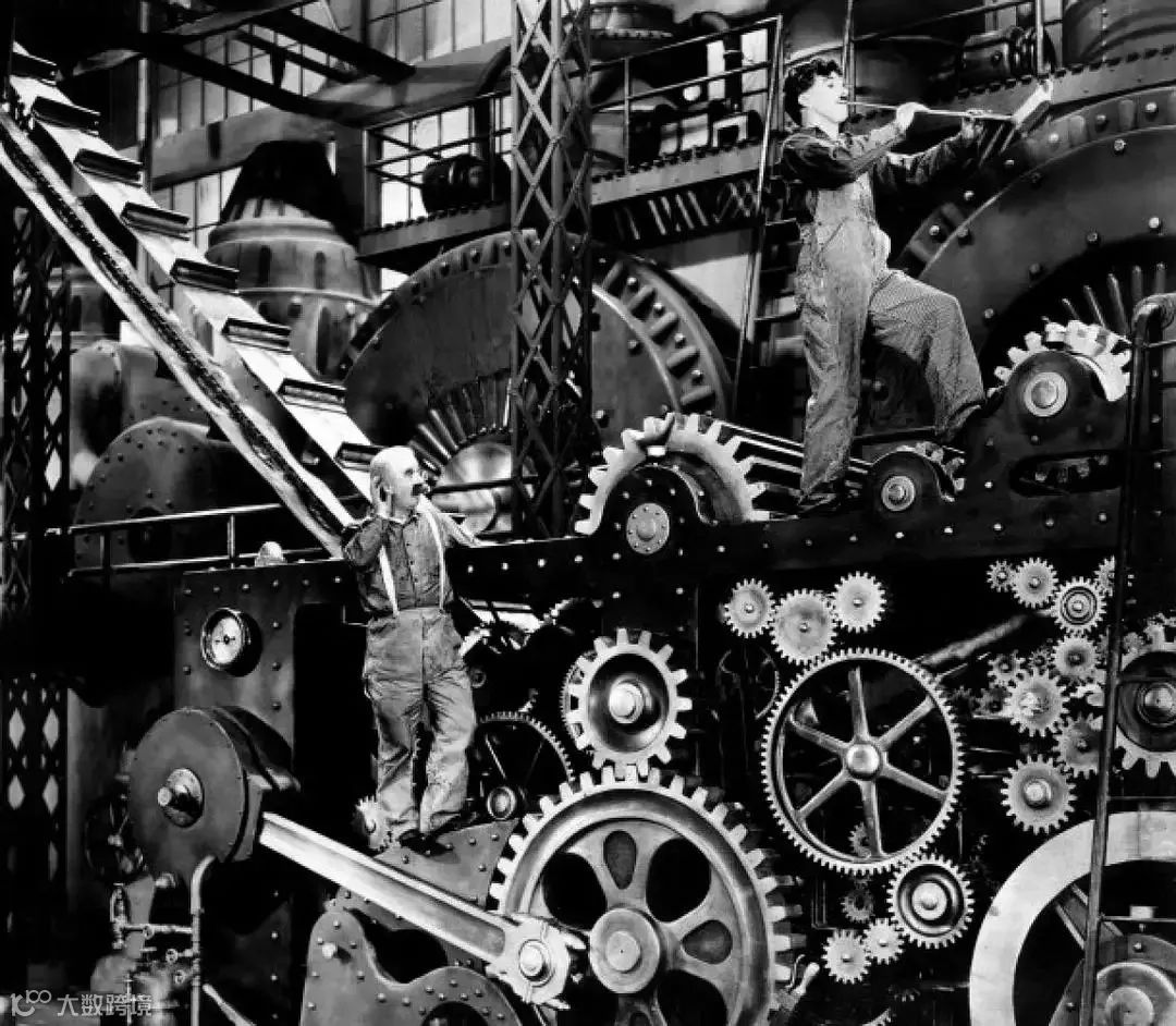 卓别林经典作品《摩登时代》剧照,对流水线工作将人异化现象的讽刺