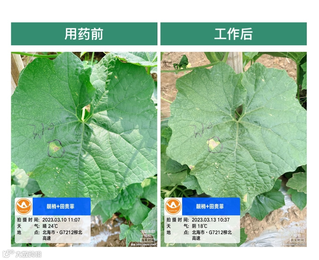 3月10日,我们在这块地进行了新长山田贵菲750倍+靓梢750倍实验,用于防治黄瓜抗性霜霉和角斑病,下面我们来看下实际防控效果: