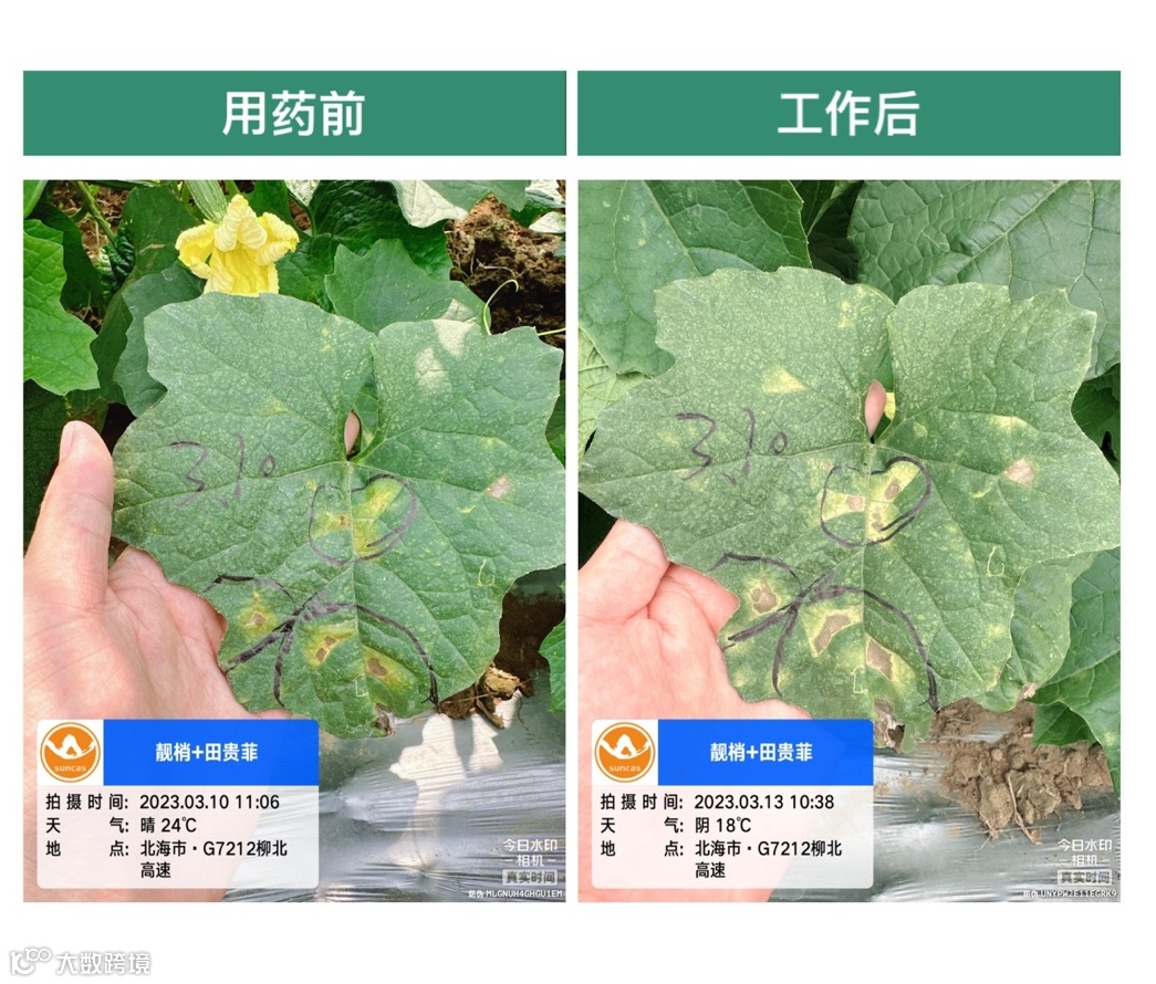 为何使用这个配方药效这么突出?这是因为田贵菲对霜霉病有很好的治疗保护作用,而靓梢能增加田贵菲在叶片上的渗透展着性,提升耐雨水冲刷能力,且具有很好的保护性能,两者混配能起到1+1大于2的效果,且能防控霜霉、晚疫、角斑、软腐、炭疽等多重病害,使用更放心。