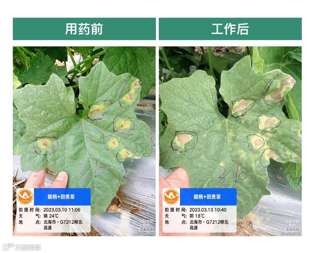 可以明显看到,用过这个方案处理的叶片,病斑处干枯不再扩散,用手轻轻一搓,病斑处叶片就可碎裂,证明霜霉病不再扩散。