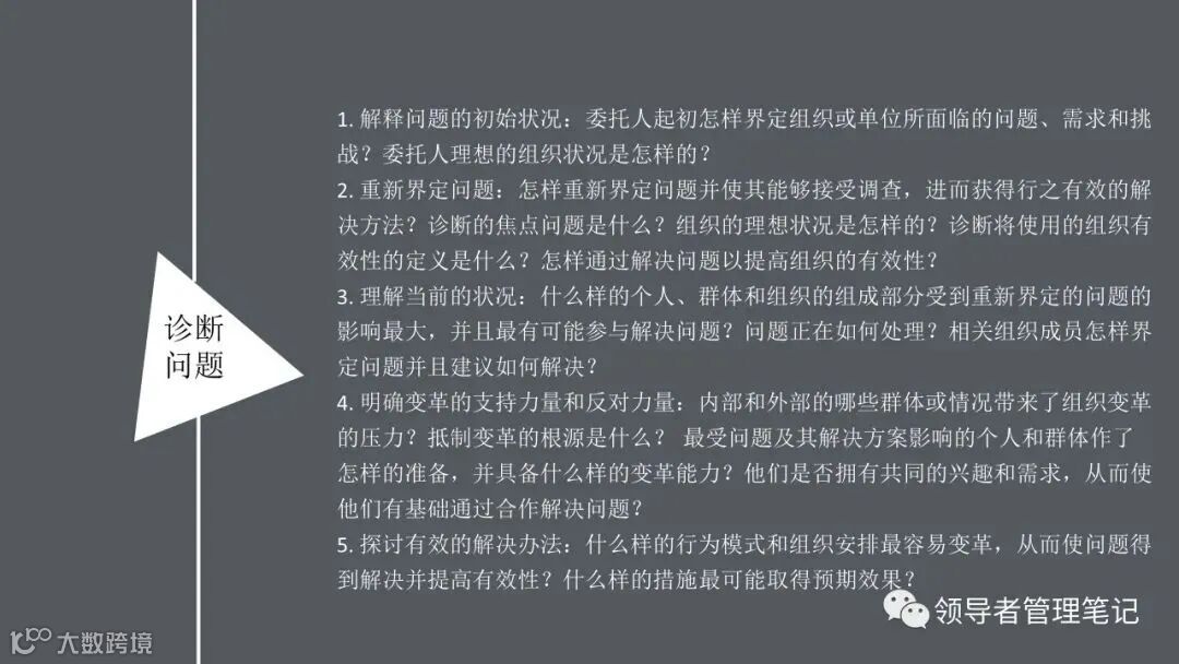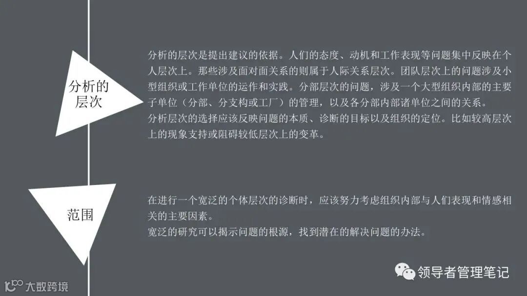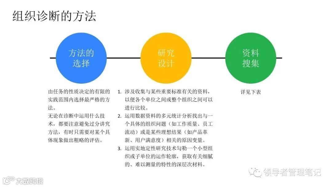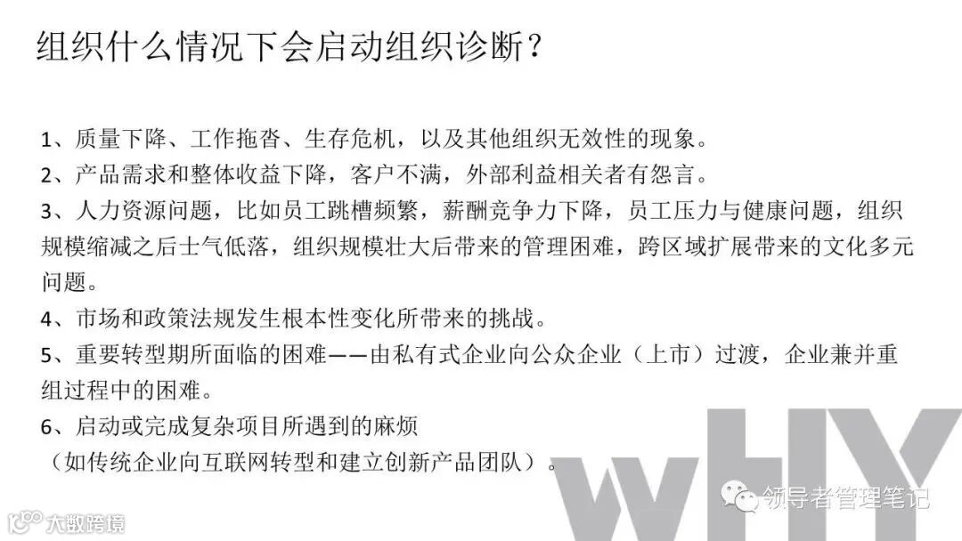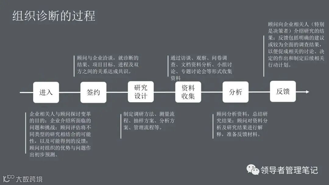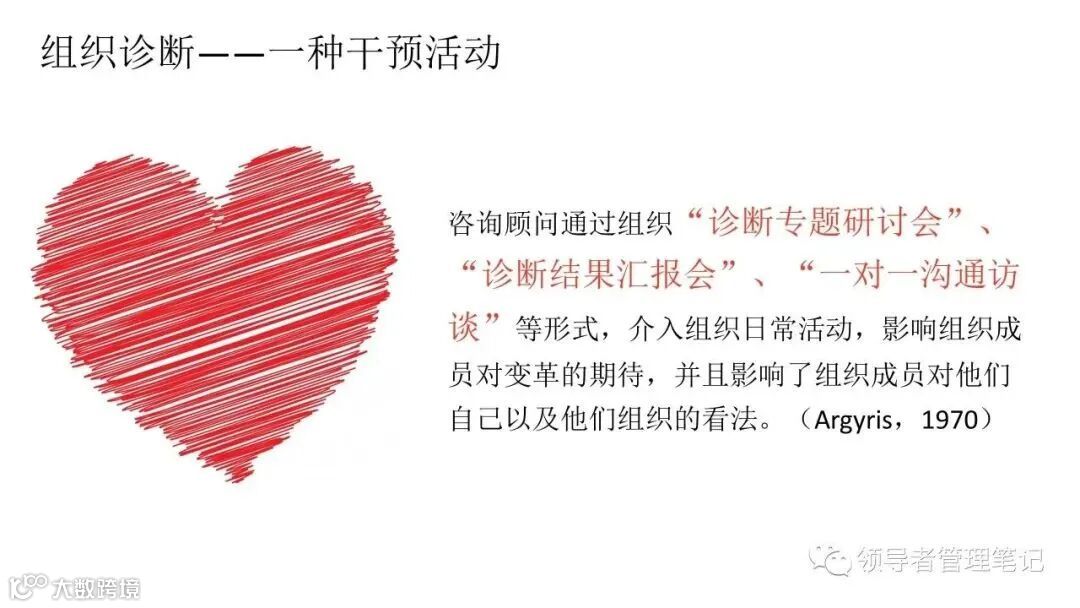 ►领导者说:何为组织诊断?管理人员、研究人员或咨询顾问,运用一些概念化的模型和实用的研究方法,来评估你们组织当前的健康状况,发现已存在的或潜在的问题,从而提出解决问题的方法,迎接挑战,最终提高组织整体绩效的整个过程。。