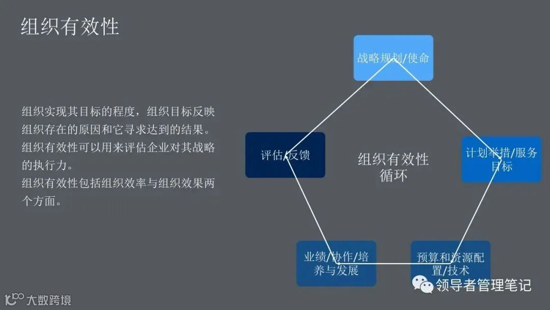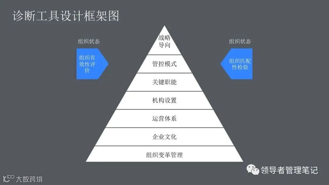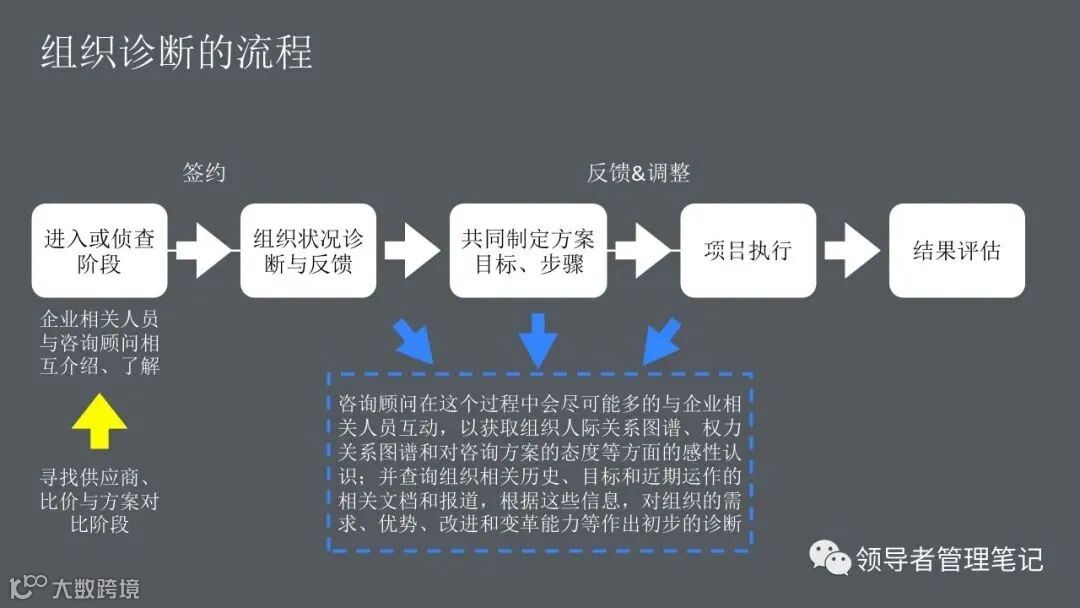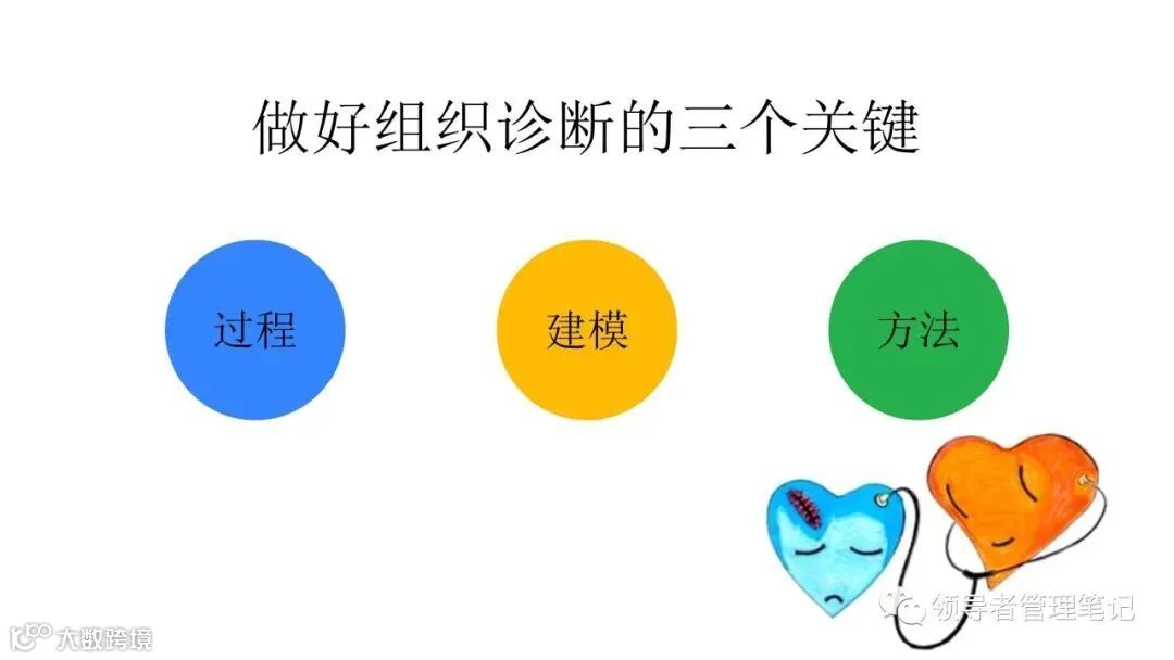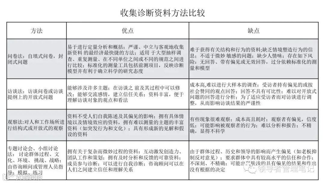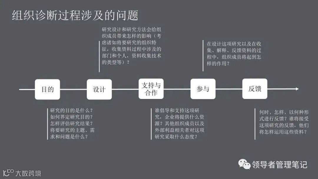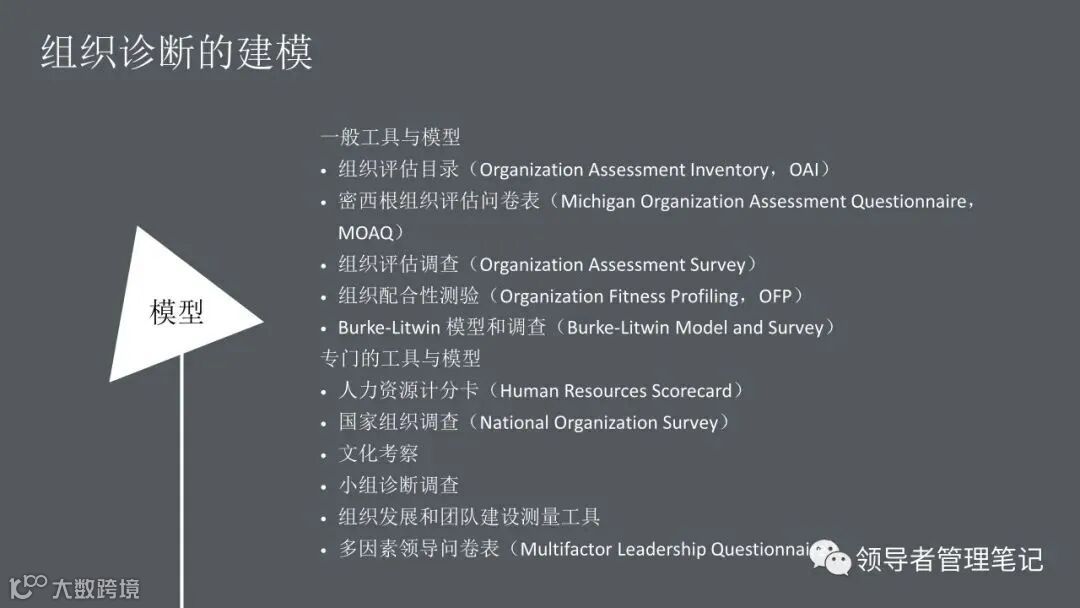 ►领导者说:何为组织诊断?管理人员、研究人员或咨询顾问,运用一些概念化的模型和实用的研究方法,来评估你们组织当前的健康状况,发现已存在的或潜在的问题,从而提出解决问题的方法,迎接挑战,最终提高组织整体绩效的整个过程。。