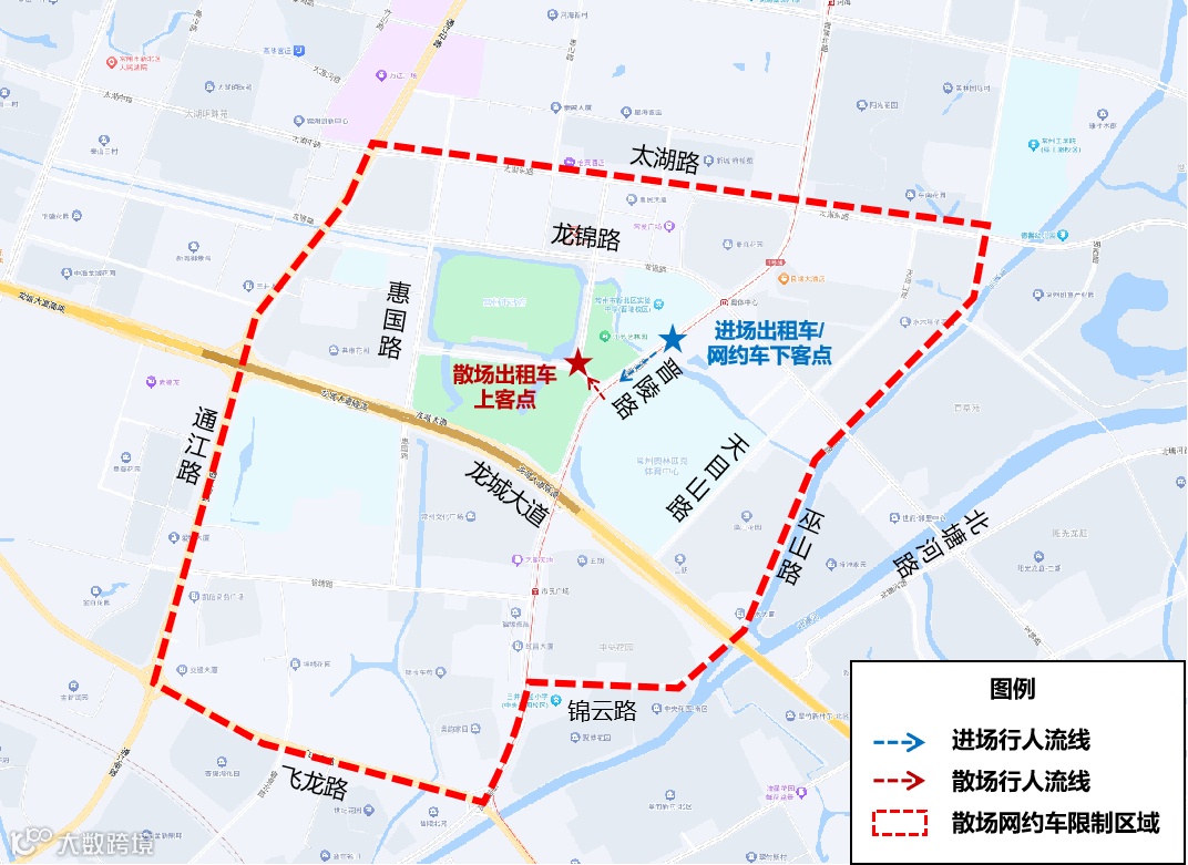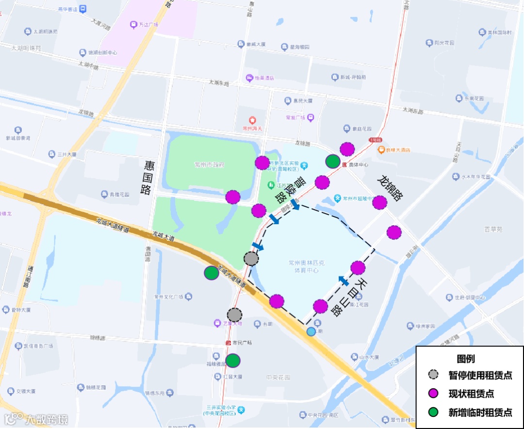 晋陵路龙城大道北侧100米、南侧150米共2处共享单车租赁点临时取消,为满足观众共享单车停取需求,新增以下3处临时租赁点: