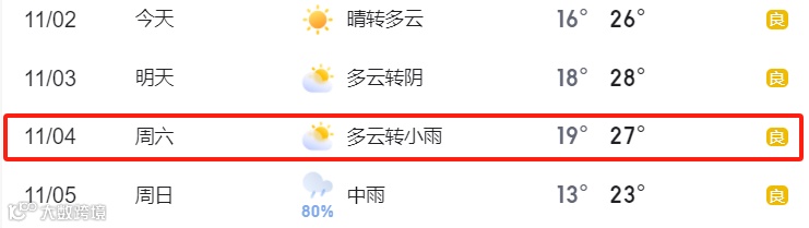 据气象台发布天气预报显示 11月04日 多云转小雨20-27℃