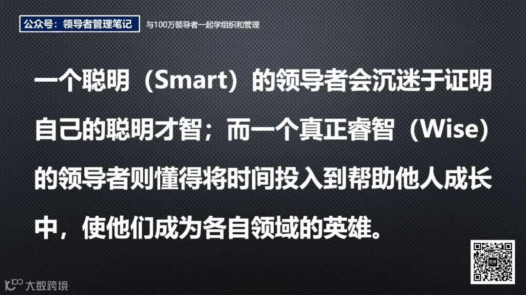 一个聪明(Smart)的领导者可能会沉迷于证明自己的聪明才智,而一个真正睿智(Wise)的领导者则懂得将时间投入到帮助他人成长中,使他们成为各自领域的英雄。这样的领导者明白,真正的成功不在于个人的荣耀,而在于能够创造一个让每个人都能够发光发热的环境。这正是优秀领导者所追求的最高境界——成就他人,共创辉煌。