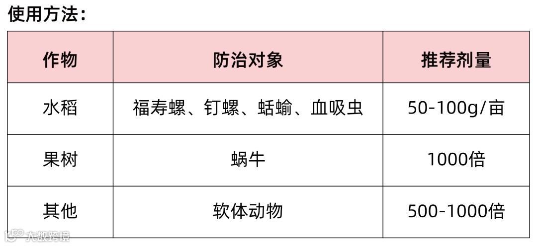 四聚乙醛:四聚乙醛是一种选择性强的杀螺剂。外观浅蓝色,遇水软化,有特殊香味,有很强的引诱力。当螺受引诱剂的吸引而取食或接触到药剂后,使螺体内乙酰胆碱酯酶大量释放,破坏螺体内特殊的黏液,使螺体迅速脱水,神经麻痹,并分泌黏液,由于大量体液的流失和细胞被破坏、导致螺体、蛞蝓等在短时间内中毒死亡。