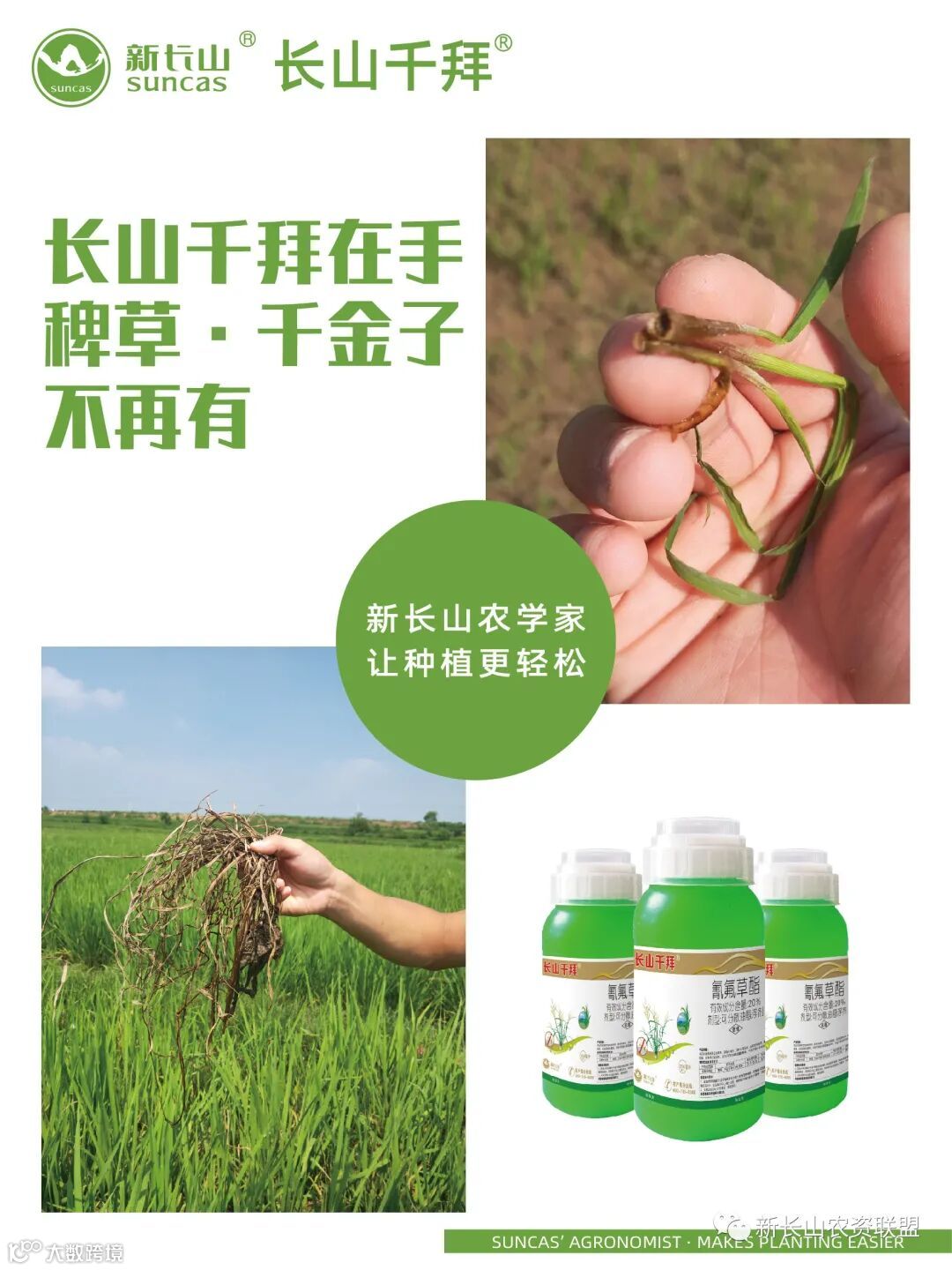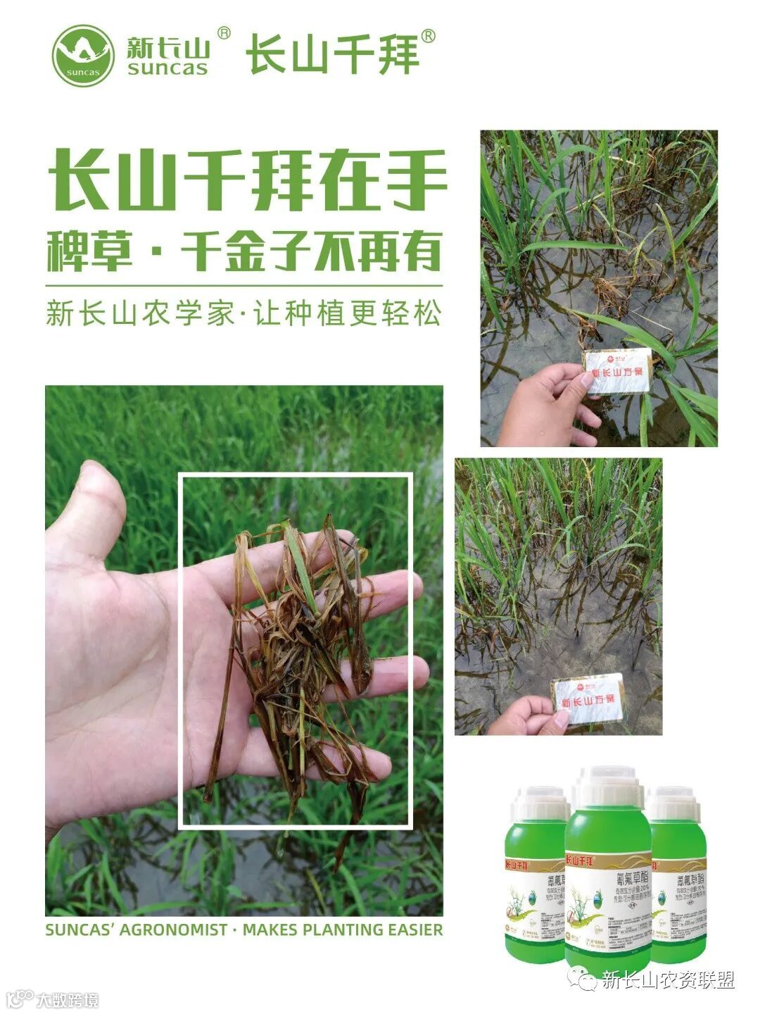 长山千拜®(20%氰氟草酯可分散油悬浮剂)是新长山经过多年的试验筛选出来的优秀剂型。它可防止粒滴凝聚变大;可增加粒子湿润性、粘附性或渗透性;同时还可防止有效成分被分解。