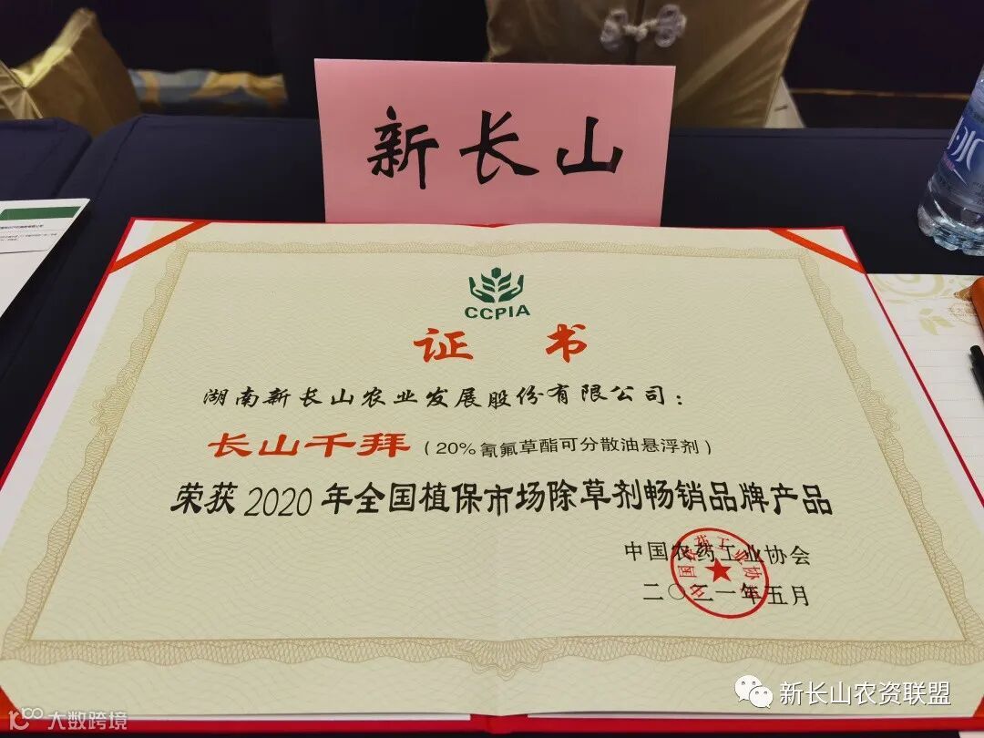 2021年5月12日在安徽合肥召开的第八届农药行业经济运行分析会暨农药行业排行榜发布会上,长山千拜®荣获“2020年全国植保市场除草剂畅销品牌产品”荣誉称号。