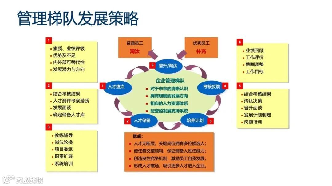 管理梯队发展策略涵盖人才盘点、考核反馈、培养计划、晋升/淘汰和人才储备等环节。其优势在于确保人才不断层、顺利完成任务交接、形成良性竞争、激励员工发展以及吸引更多优秀人才。