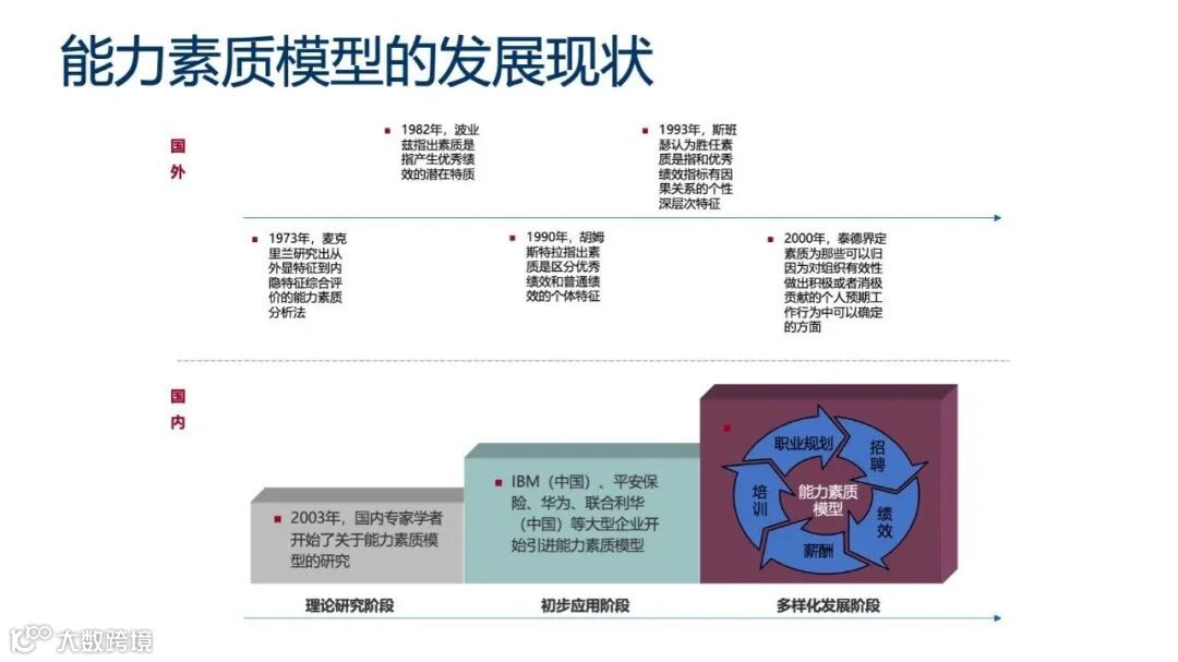 能力素质模型的发展经历了理论研究、初步应用和多样化发展阶段。国内许多大型企业已开始应用能力素质模型于招聘、绩效、薪酬、培训和职业规划等领域。