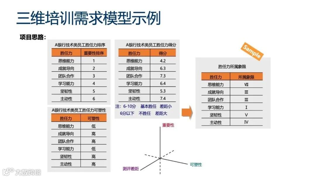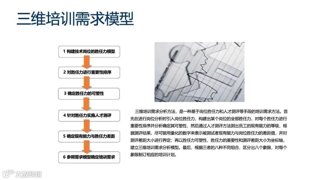 它首先构建岗位的胜任力模型并进行重要性排序,然后分析胜任力的可塑性,并通过人才测评确定员工现有能力与胜任力的差距。最后,结合重要性、可塑性和差距,建立三维模型进行培训需求分析,并制定相应的培训计划。