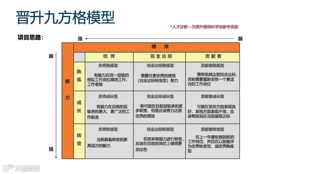 模型为晋升决策提供科学依据。晋升九方格模型是一种常用的人才诊断工具,它结合绩效和能力两个维度,将员工划分为不同的类别,为晋升提供参考。
