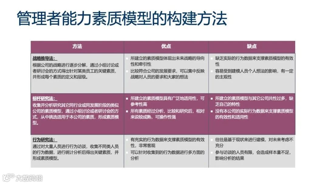 通过对大量员工进行行为事件访谈(BEI),收集并分析行为数据,从而提炼出关键素质并构建模型。此方法具有坚实的行为数据基础,客观性强,且能进行多维度分析。但其局限性在于可能更侧重现状,对未来考虑不足,且样本量可能有限。