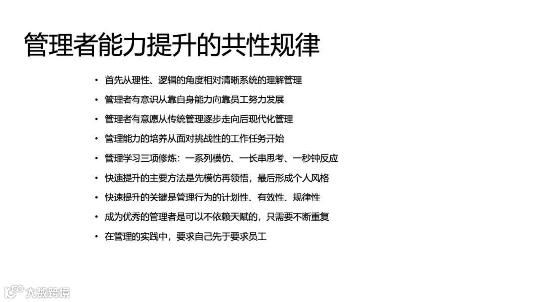 管理者能力提升具有一定的共性规律,包括从对管理的理性认知到依靠团队努力,以及从传统管理向现代化管理转变。能力的培养始于应对挑战性任务,通过模仿、领悟和实践形成个人风格。关键在于管理行为的计划性、有效性和规律性。