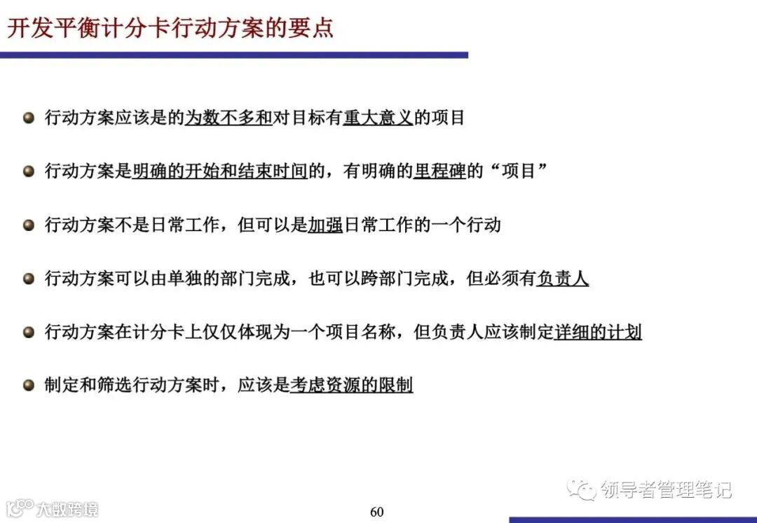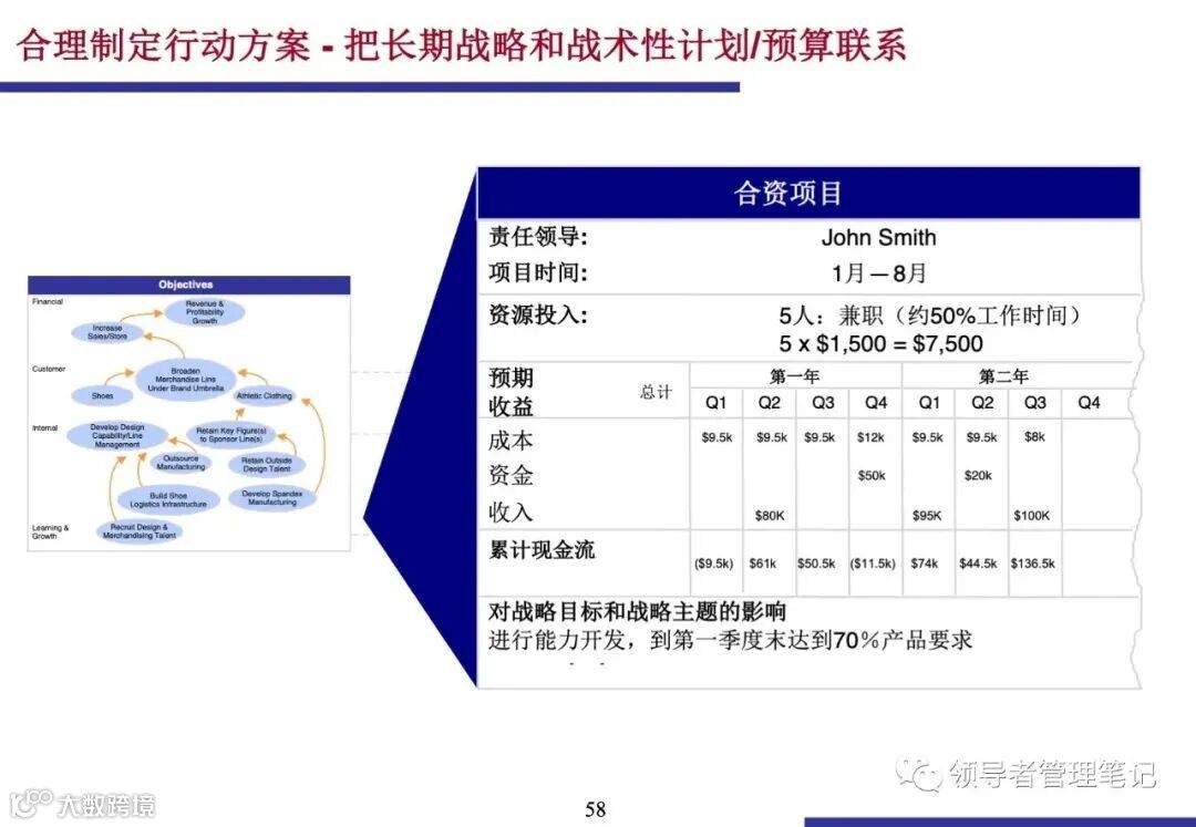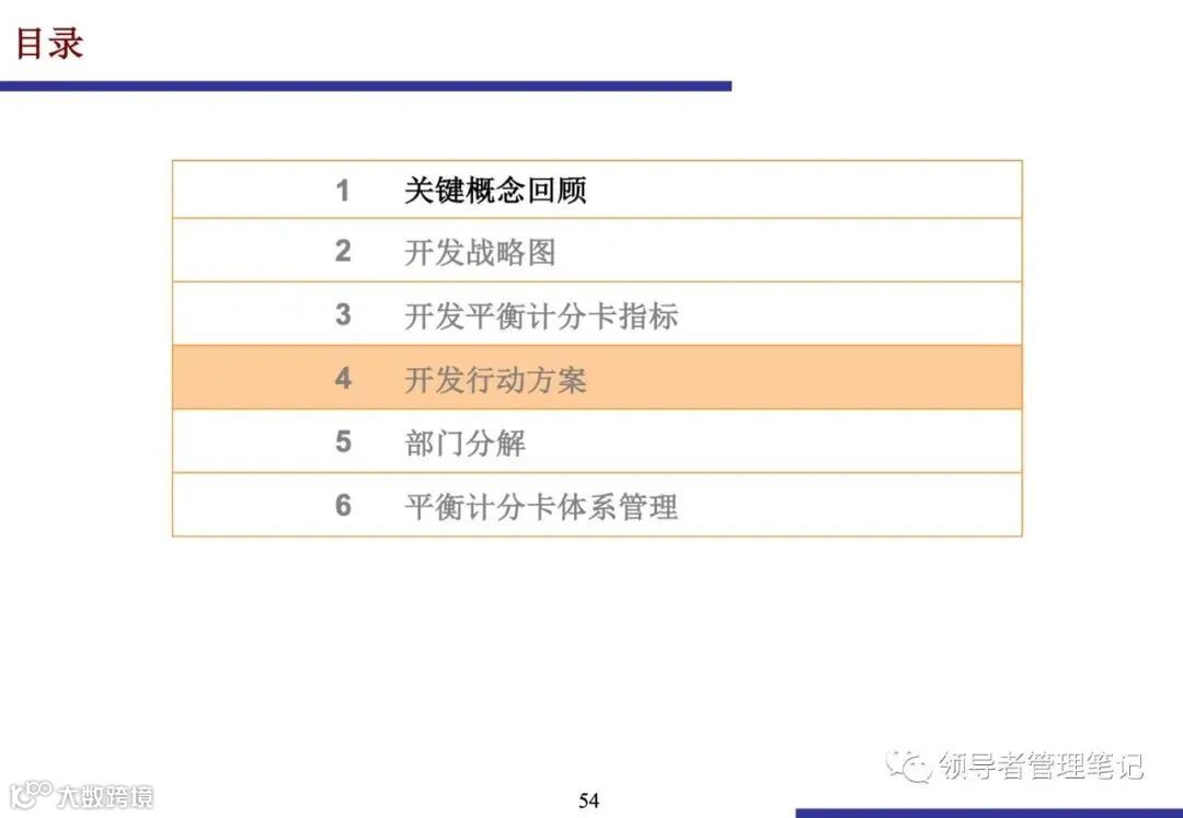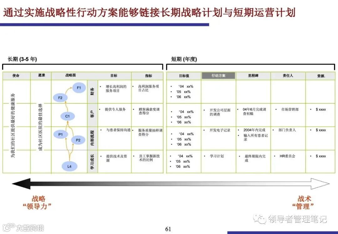 行动方案是连接长期战略与短期运营的桥梁.它必须有明确的开始和结束时间、里程碑、预算和负责人.行动方案应聚焦于弥补绩效差距,并对战略目标的实现产生重大影响.
