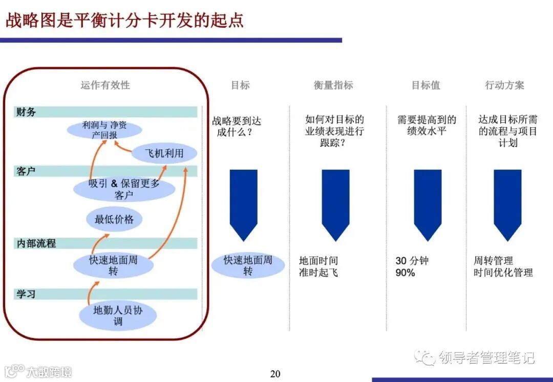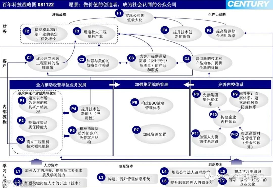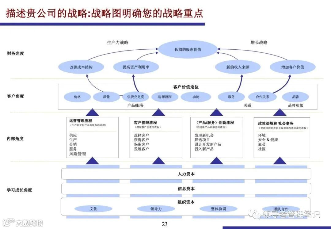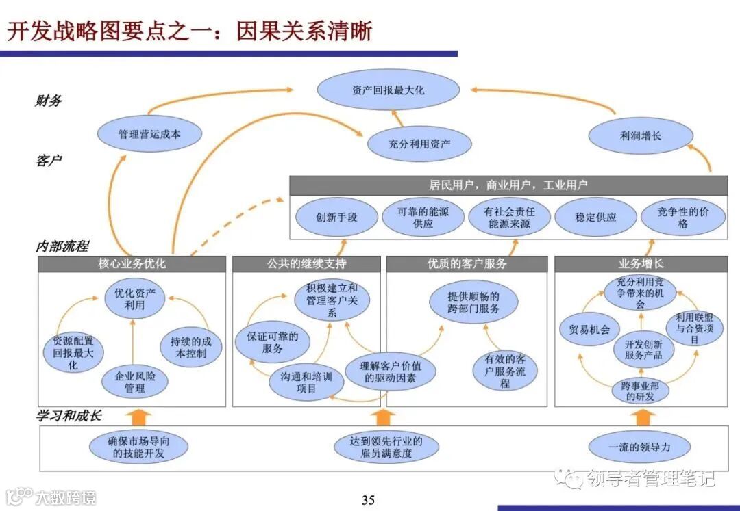 例如,要实现财务增长,可能需要提升客户满意度,而提升客户满意度则依赖于高效的内部流程和具备所需技能的员工.战略图应突出战略重点,并考虑短期性和长期性战略主题的平衡.