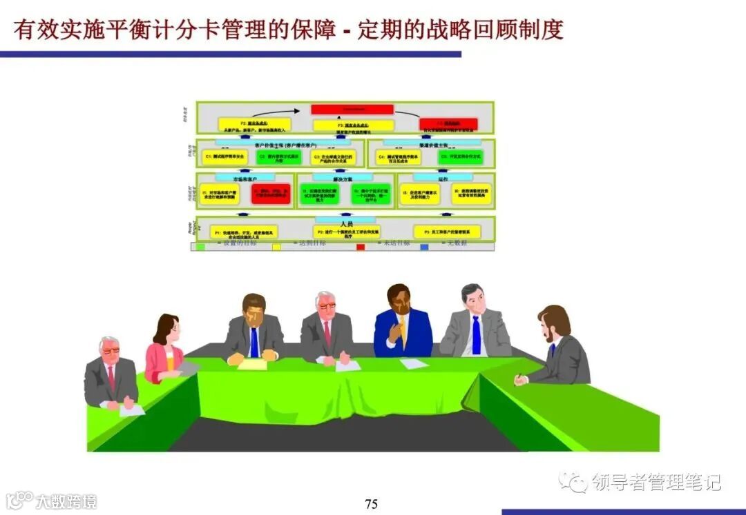 定期的战略回顾会议是BSC体系有效性的关键.通过对各维度指标状态和战略行动方案进展的分析,及时发现战略执行中的问题,并进行讨论和调整.文档中展示了战略回顾报告的范例,通过颜色标识清晰地呈现了目标的达成情况,并包含绩效分析和建议的行动计划。