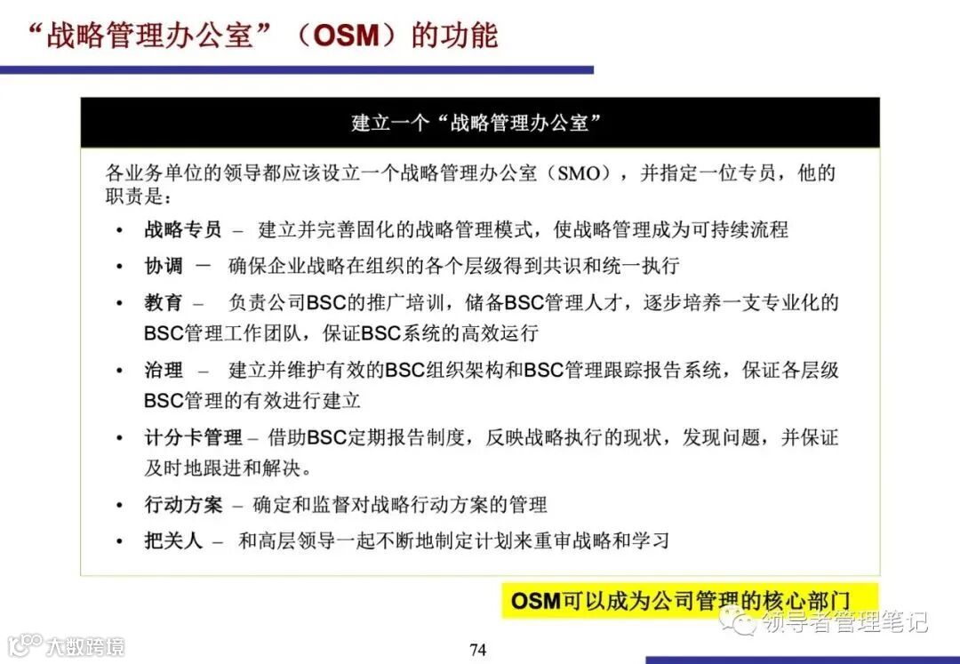 OSM是BSC体系运行的组织保障.其功能多样,包括建立和完善战略管理模式、协调各业务单元战略执行、推广BSC知识、建立和维护BSC管理跟踪报告系统、监督战略行动方案等。