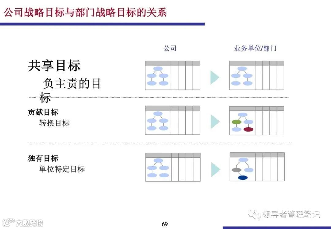 通过BSC的层层分解(Cascading),将公司层面的战略目标和指标分解到部门和个人,确保各层级目标的对齐.部门BSC的开发需要理解部门定位,分析与公司战略目标的链接,明确共享目标、贡献目标和独有目标.部门负责人在此过程中扮演重要角色,负责细化部门计分卡内容、组织战略回顾等.