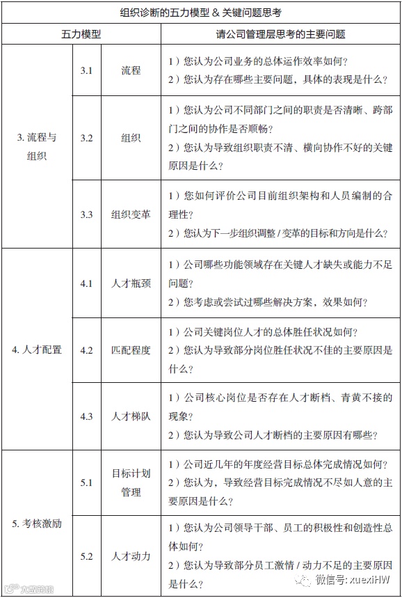 5.考核激励:主要判断自己公司的目标和绩效管理、员工工作动力和人才流动状况。