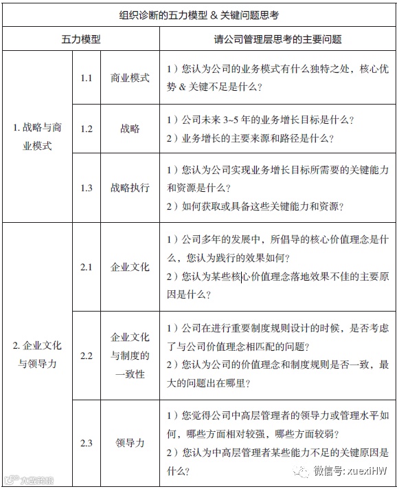 为了帮助你全面了解自己的组织现状,从而为组织架构设计提供系统而准确的输入,建议你用我们咨询团队借鉴西方理论并在中国实践中验证过的“五力模型”进行组织诊断(见表1)。