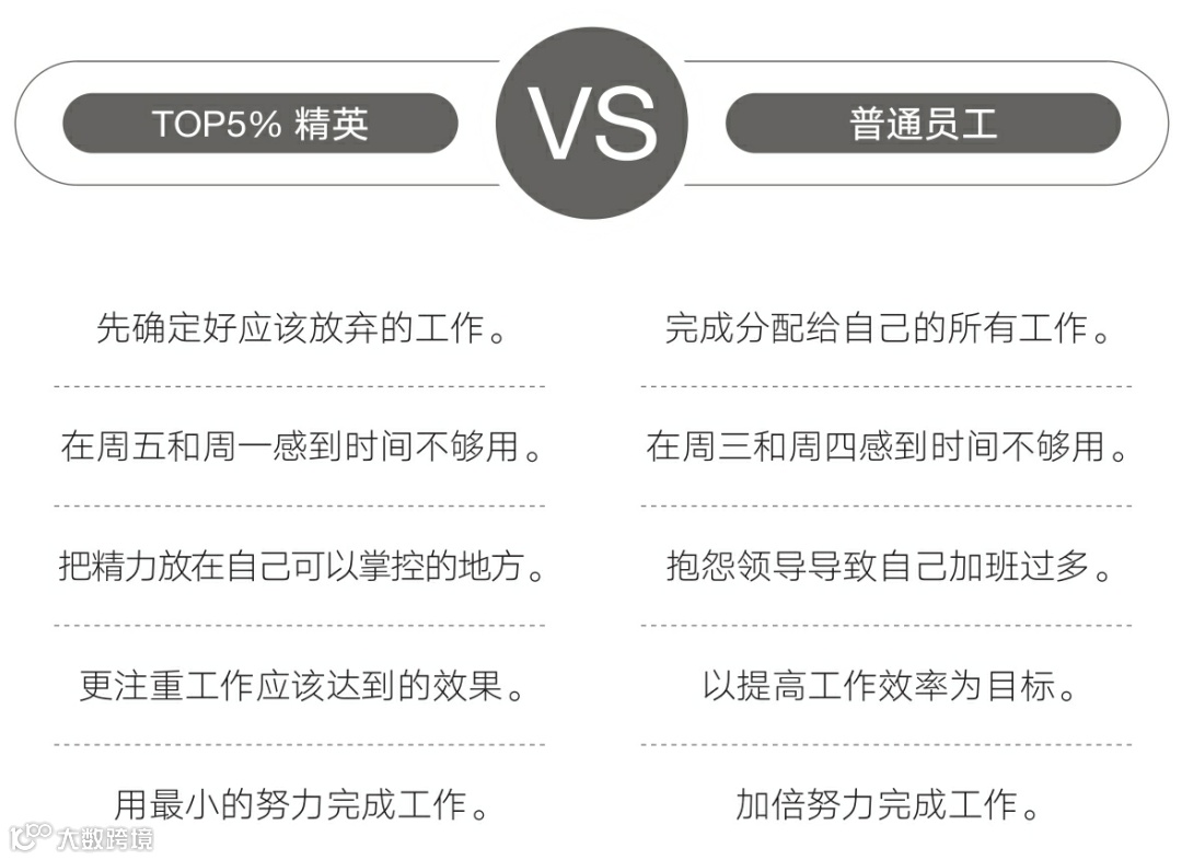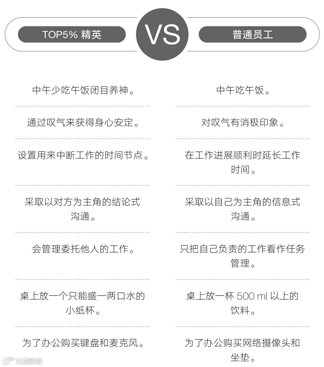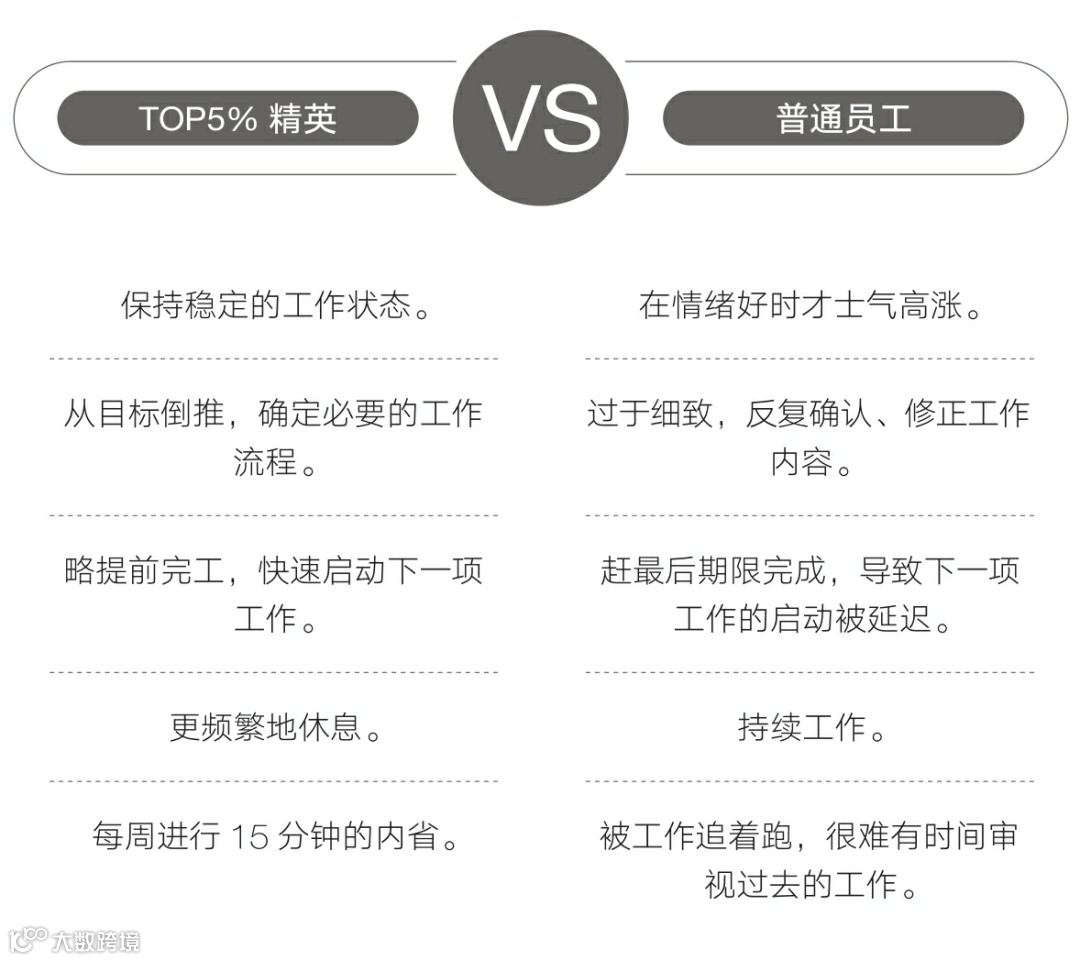 TOP5%精英常有多项任务在身,但他们不会选择同时进行,而会一项一项地完成。能完成一项工作后切换的速度极快。