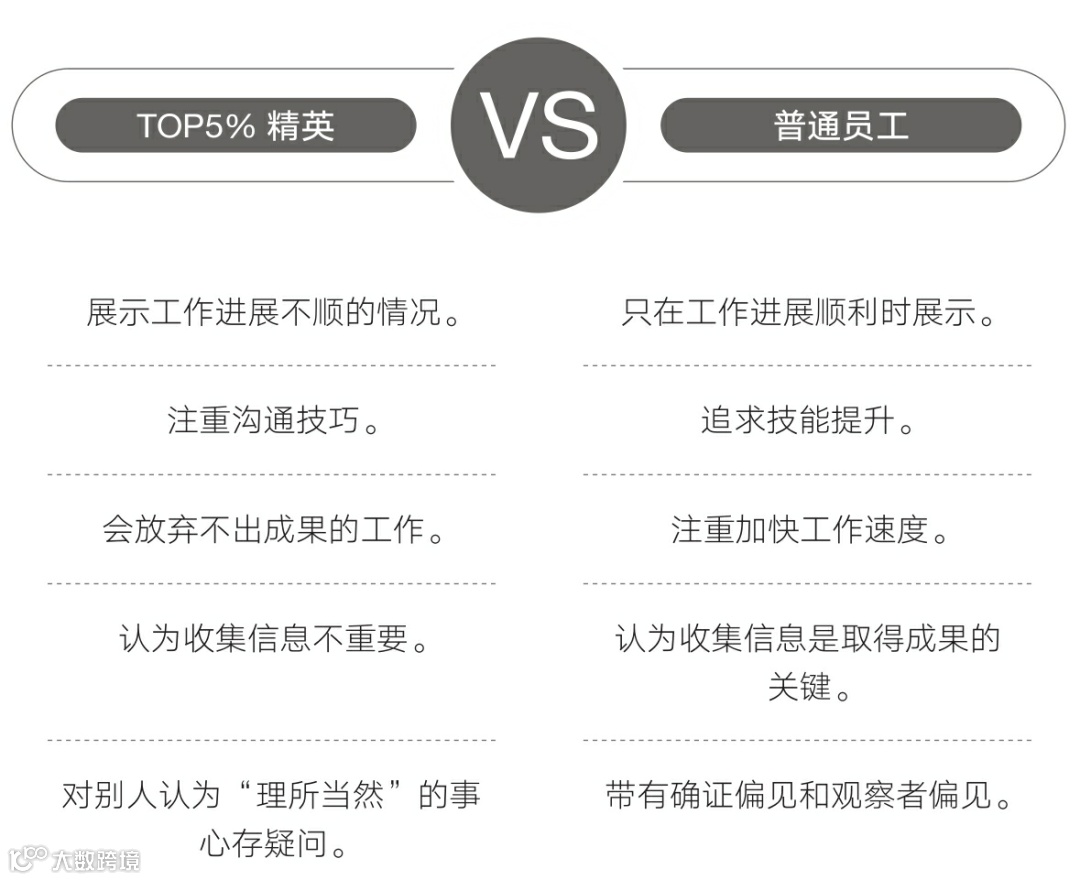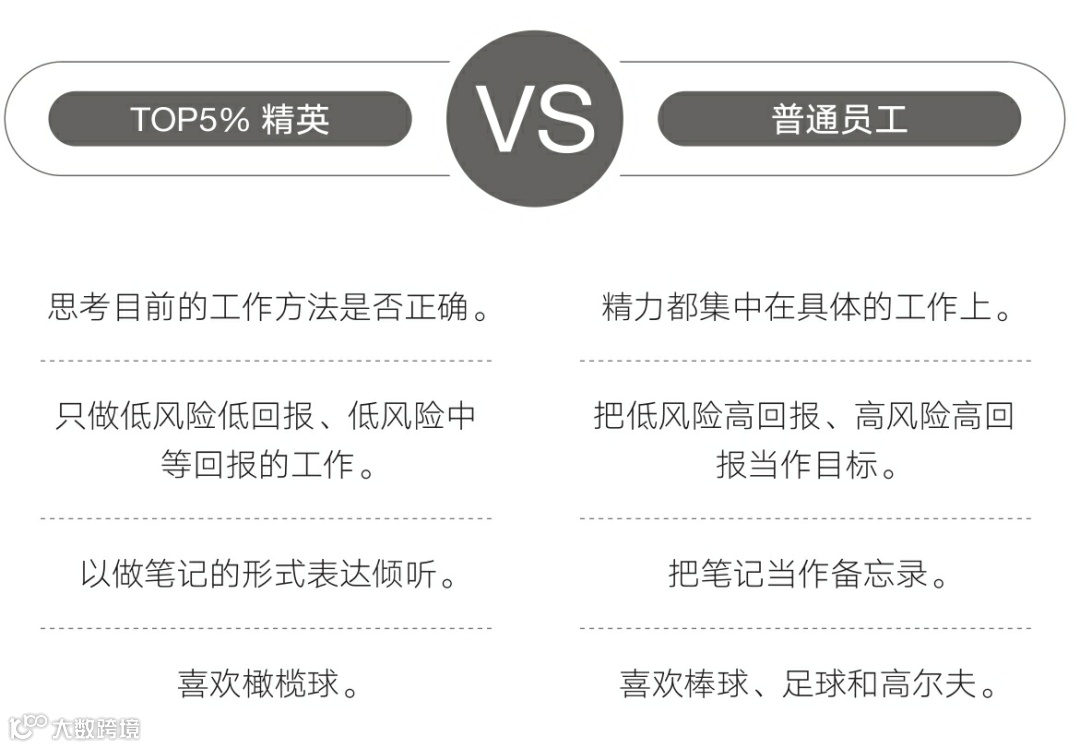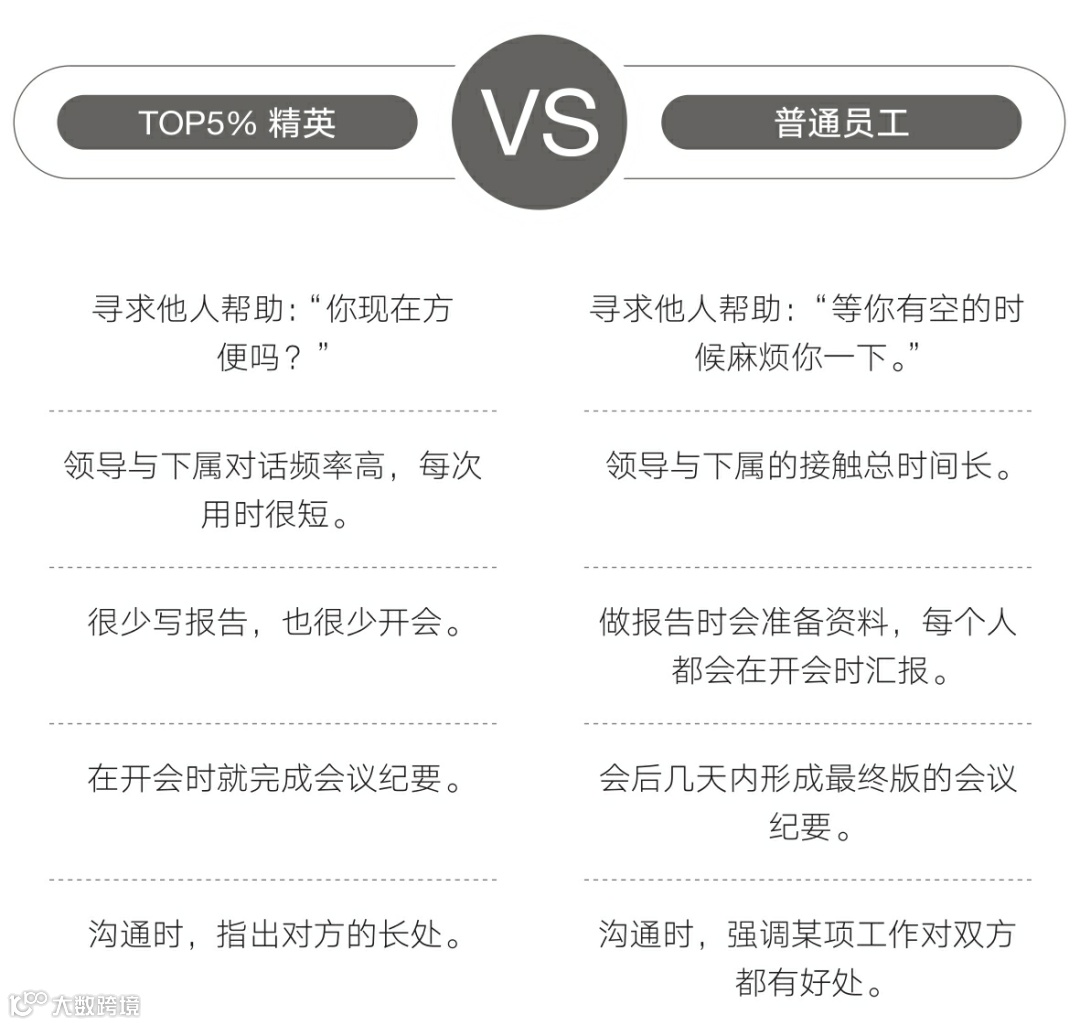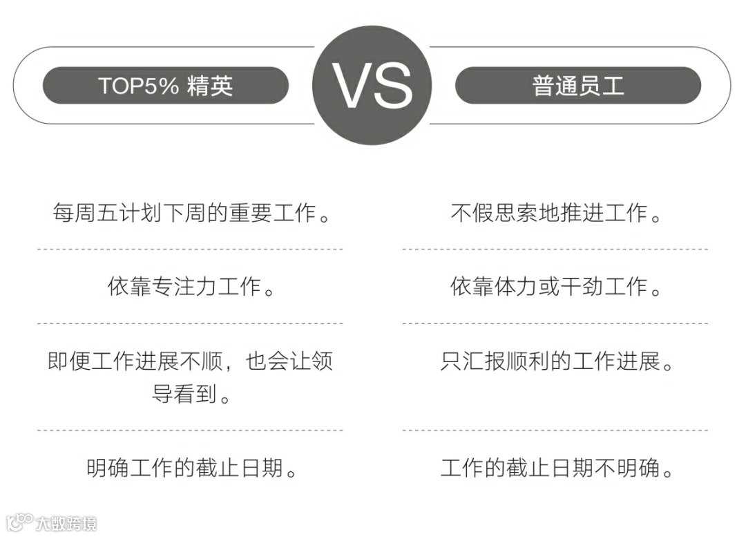 因为TOP5%精英认为,如果自己与对方在工作目标上存在分歧,就需要另花时间修正工作,从而得不到好评。举个例子,如果对方想要的成果是一张设计图纸,那么TOP5%精英就会先向对方询问图纸的具体细节,等到确认后,再开始设计。