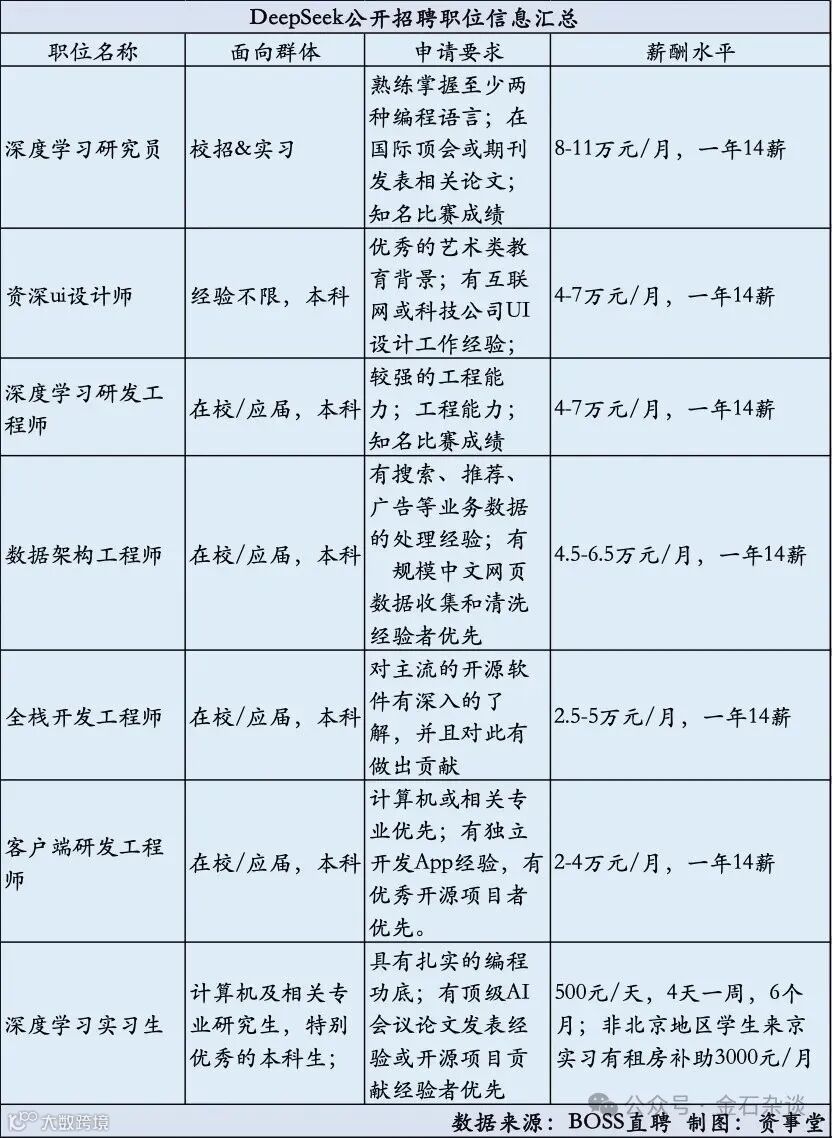 在DeepSeek曾经挂出的职位中(详见下表),年薪最高的职位是“深度学习研究员”,月薪水平位为8-11万元。以一年14薪计算,该职位年薪最高可达税前154万元人民币。